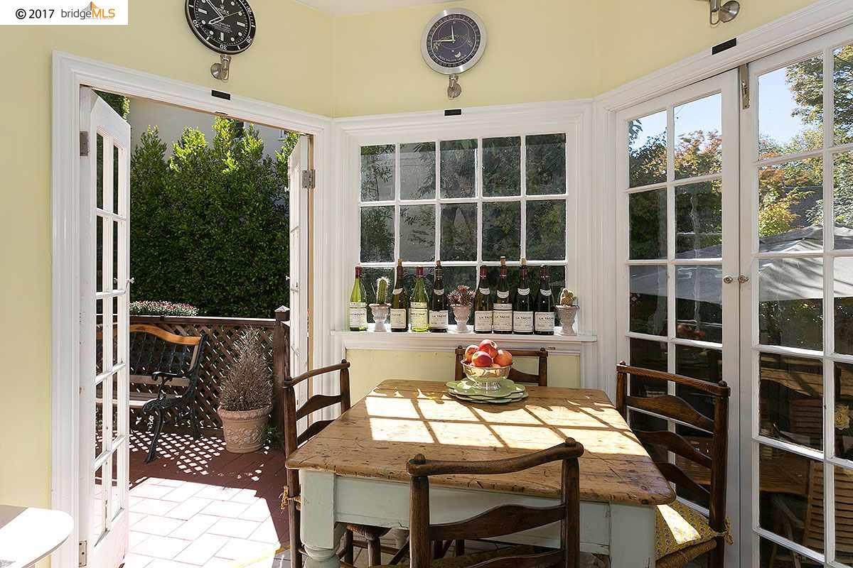 The second dining option off the living room is the formal dining room. Here the view is equally pleasing, and equally flexible. Spacious windows and French doors bring sparkling light into the room, and the doors allow access to another patio area which is shared with the home's eat-in kitchen .