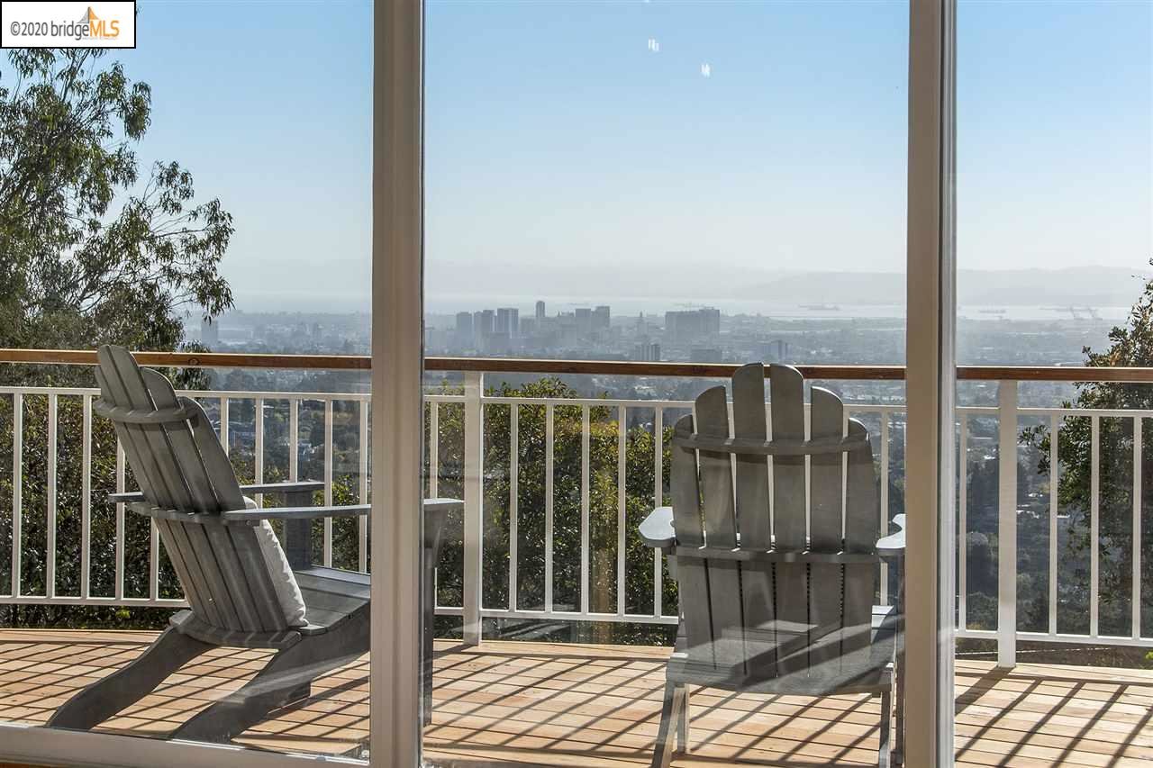 This inviting home, at 1519 Westview Drive in Berkeley, with its exterior view balconies and expansive glass doors and windows, is high above the city in the Claremont hills, and offers sweeping Bay area views of San Francisco, Oakland, The Golden Gate and Bay Bridge, and Marin.