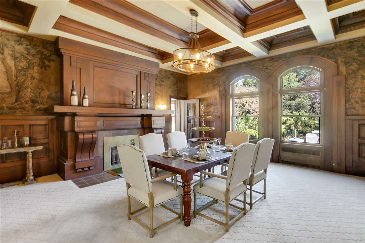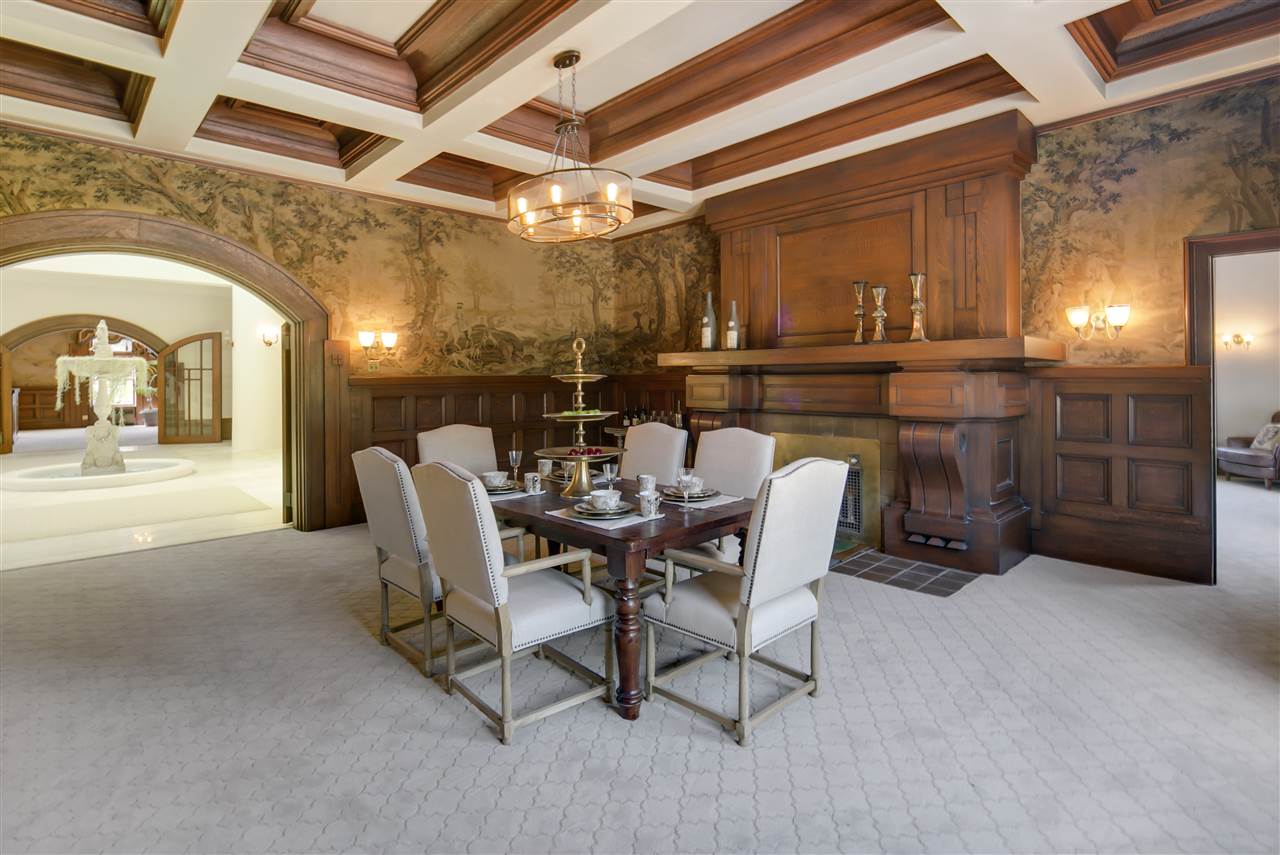 A home such as this must also have an impressive formal dining room, and this one meets those requirements. Â This dining room has the original box spring ceilings, and features a dramatic wall tapestry to add to the ambiance. Â