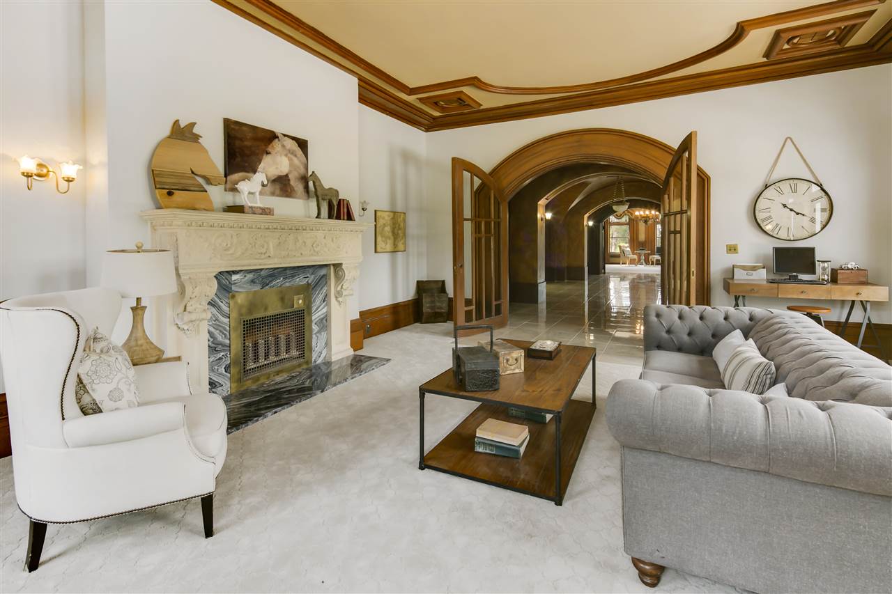 As you move around the ground floor, doors open to various rooms, each of which is pleasing in its own way.  Note the window and ceiling treatments in each one.  In fact, one of the best examples of these treatments is in the living room.  The living room also has a handsome fireplace, and chandeliers original to the home.