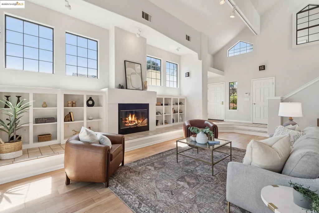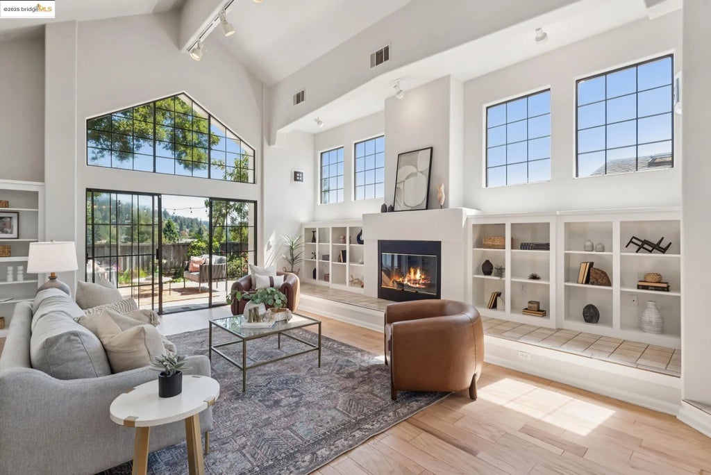 A commanding central fireplace awaits an opportunity to shed warmth and beauty when needed, and impressively paired bookcases on either side await displays of books, artwork, collectables, or glassware.