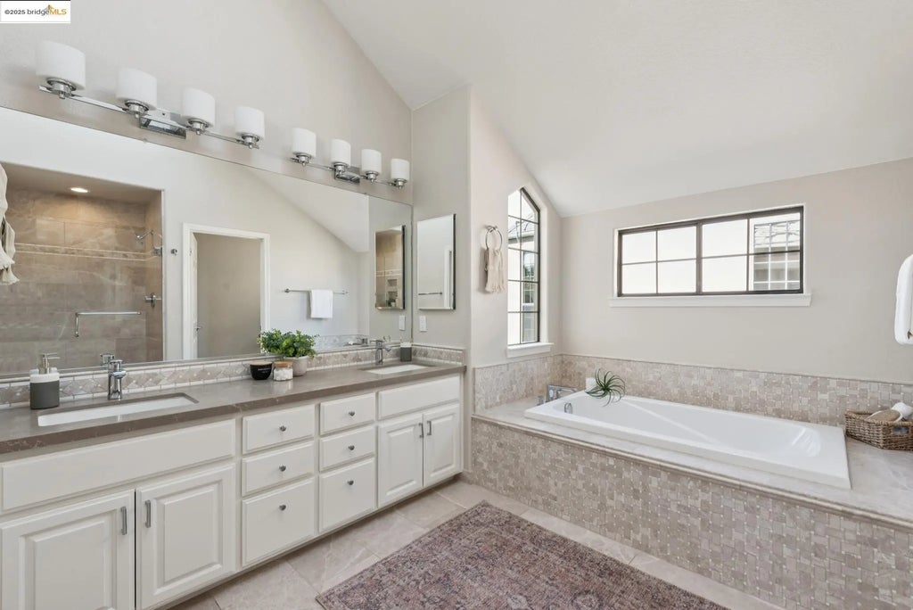 This stunning primary bathroom is one to experience. Space abounds. From the captivating bathtub to the carefully conceived counter space, this room is an impressive piece of work.