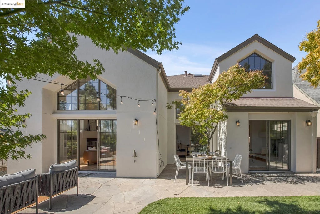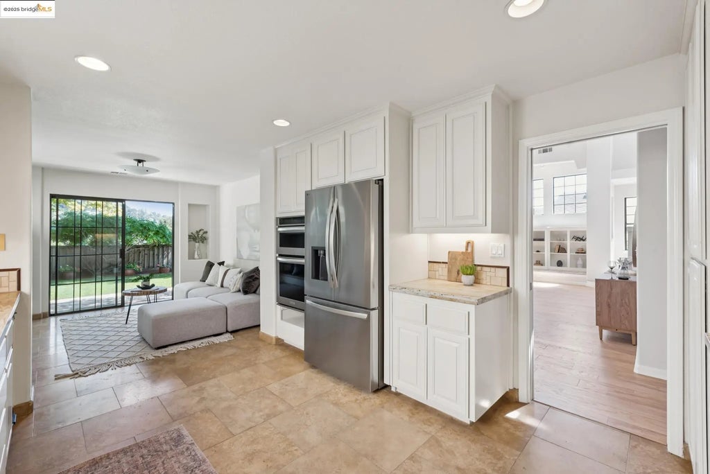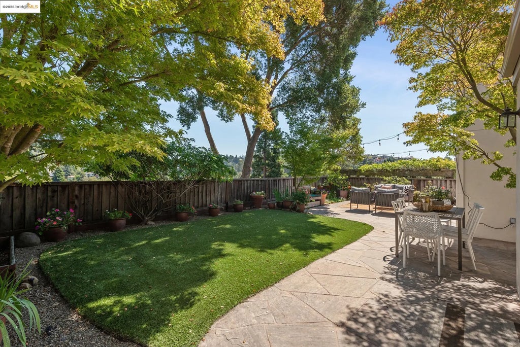 At the end of the room, a pair of sliding glass doors open to invite both residents and guests into the lush, and well established back yard for a relaxing afternoon picnic or evening meal.