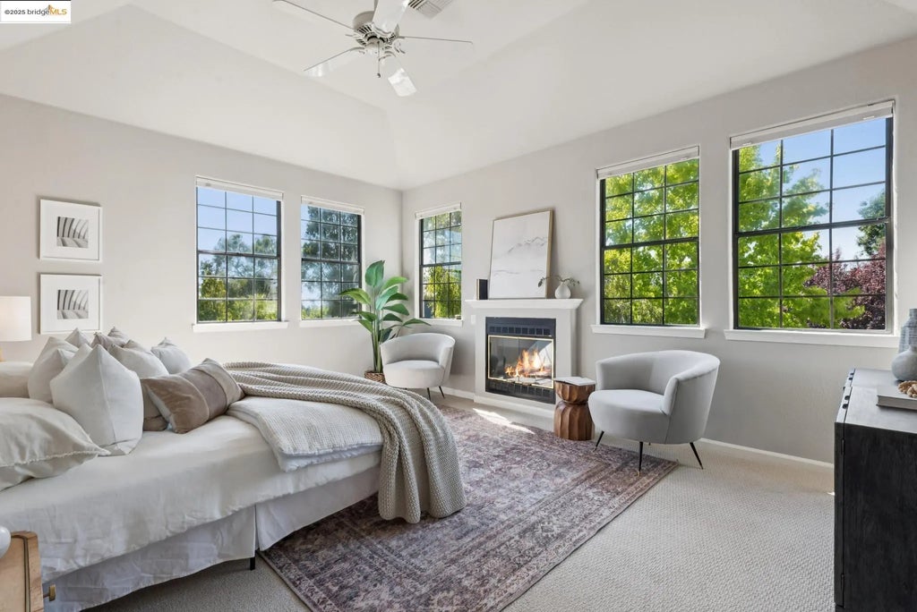 Moving to the second floor, one discovers this spacious primary bedroom that continues the design theme of glass windows throughout, and generous floor space. Its size, and its cozy fireplace encourage a variety of furniture configurations to please.