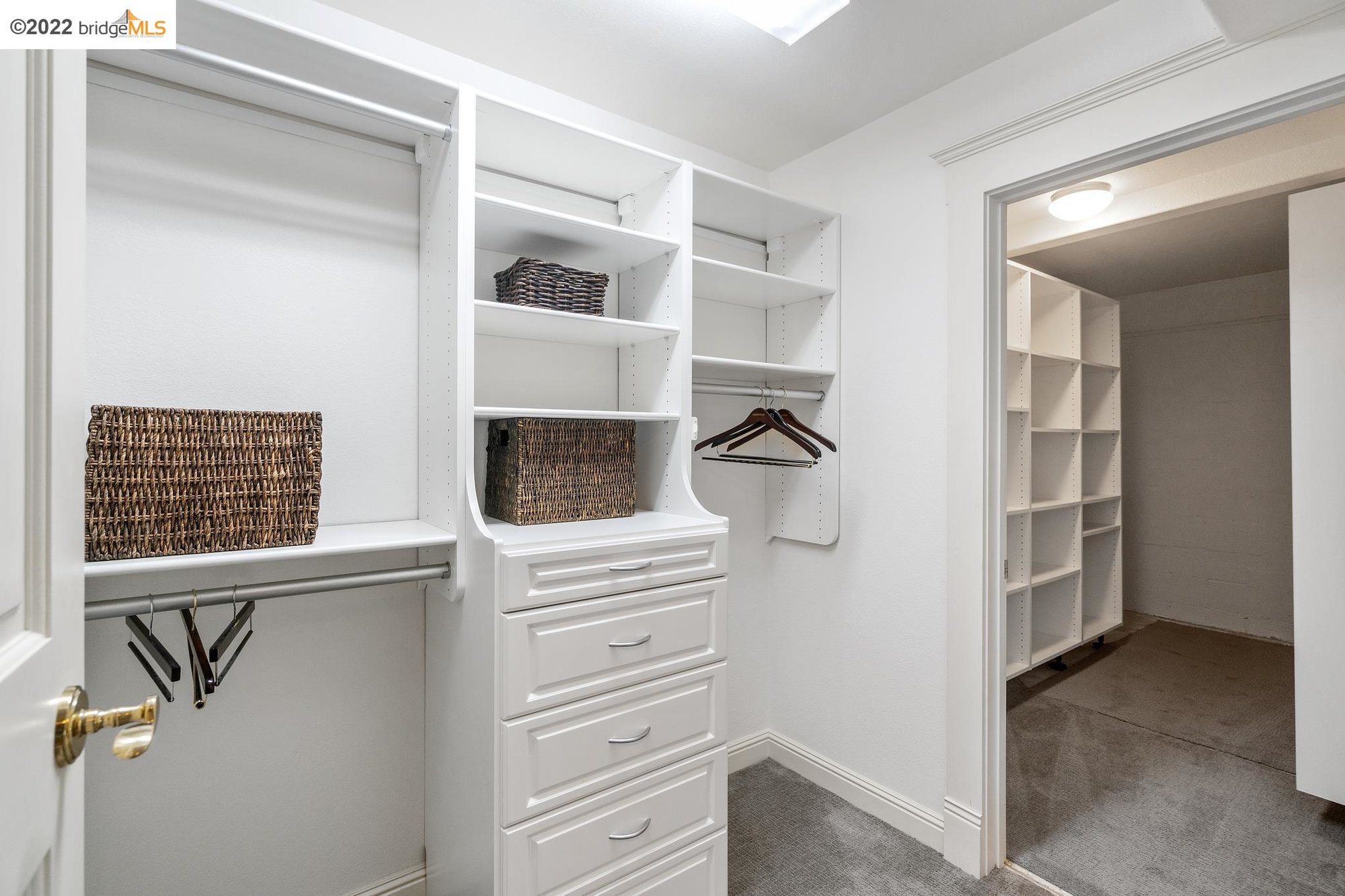 This walk in closets offers space for just about every type of clothing that one could consider. Hanging clothes, folding clothes, skirts, lingerie, shoes and hats can all fit comfortably in this imaginative space.