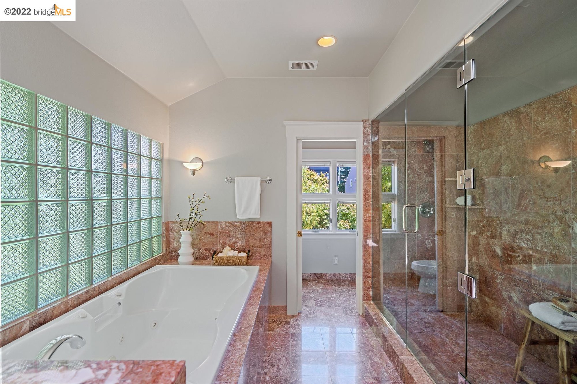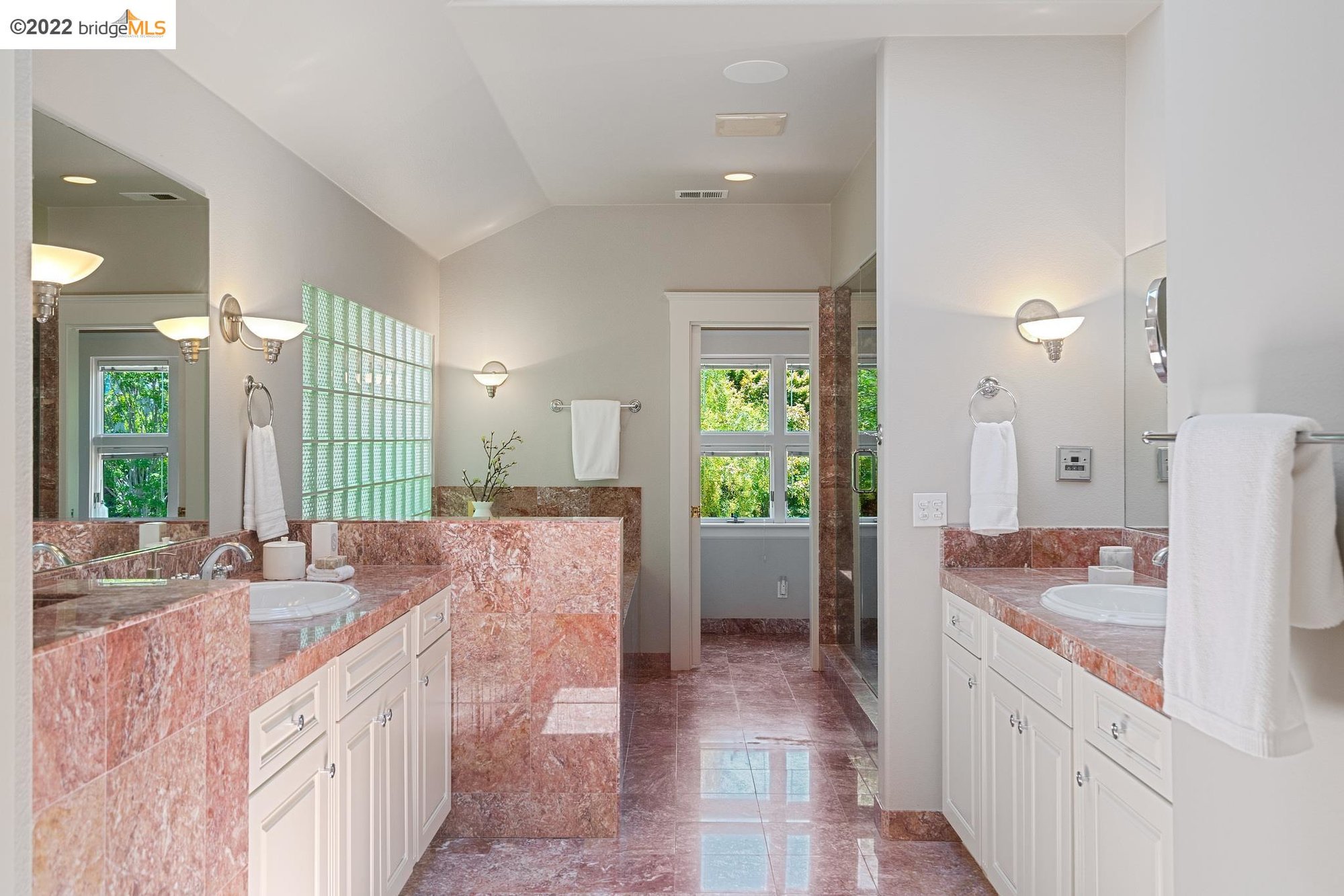 Two views of the adjacent, and uniquely conceived, primary bathroom can be seen above. Note the placement of the dual sinks for an efficient use of space on a busy morning. Dual stall showers, a bidet, a jacuzzi tub, and diffuse glass tiles above the tub complete this outstanding showplace.