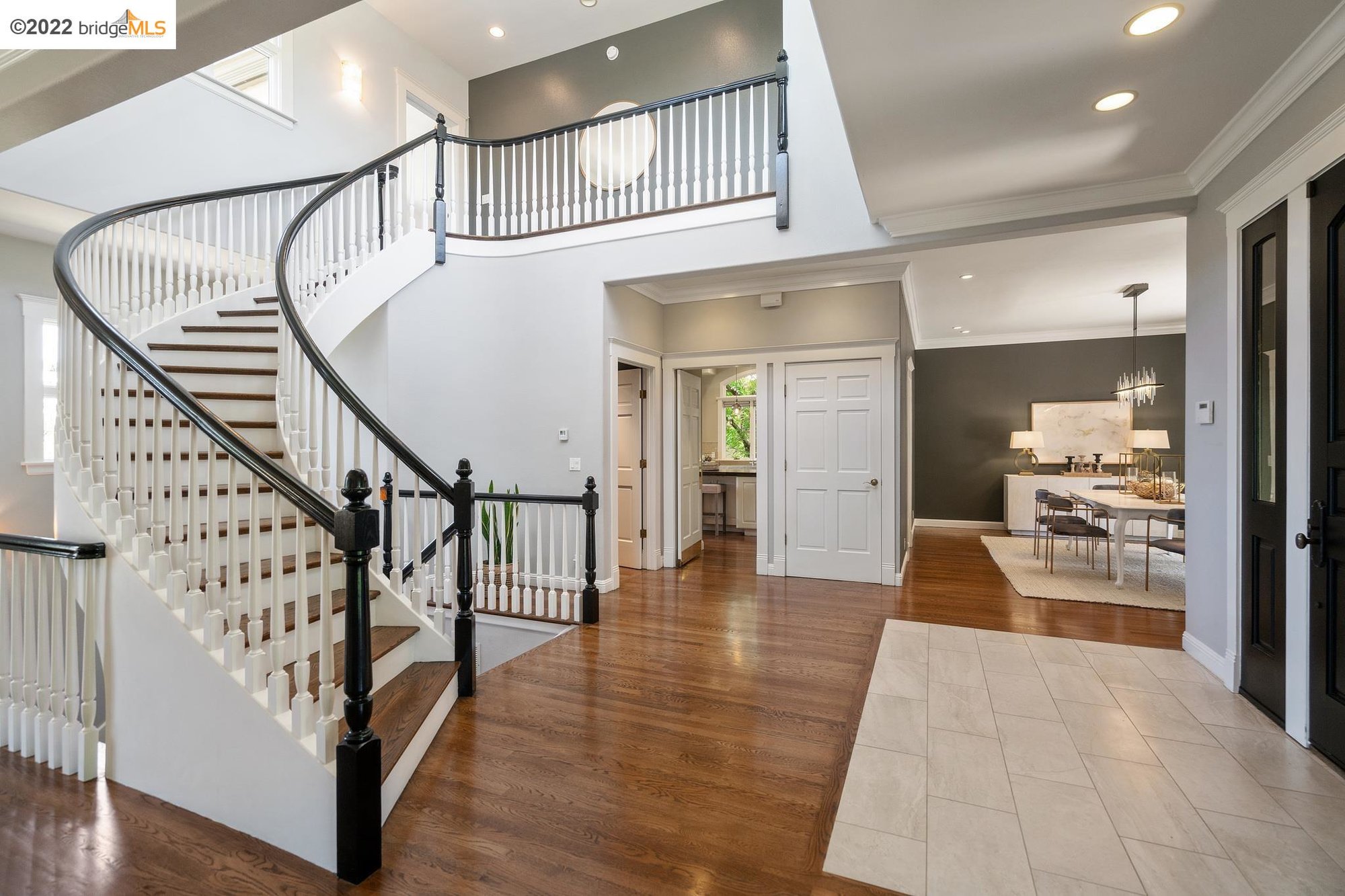 This dramatic and inviting entry illustrates the warmth and welcoming spirit of the entire home. The beauty and graceful curve of the central staircase is compelling, and the space invites easy entry to all 3 levels of the house.