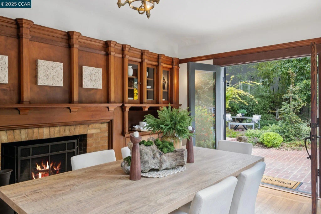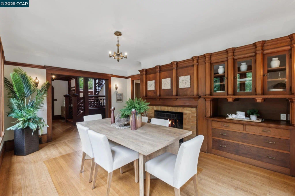 A large dining room is, and was, an important and impressive showplace. This view reflects this. The room has its own fireplace, with display space for art above, and distinctive and very effective buffet server to its right.