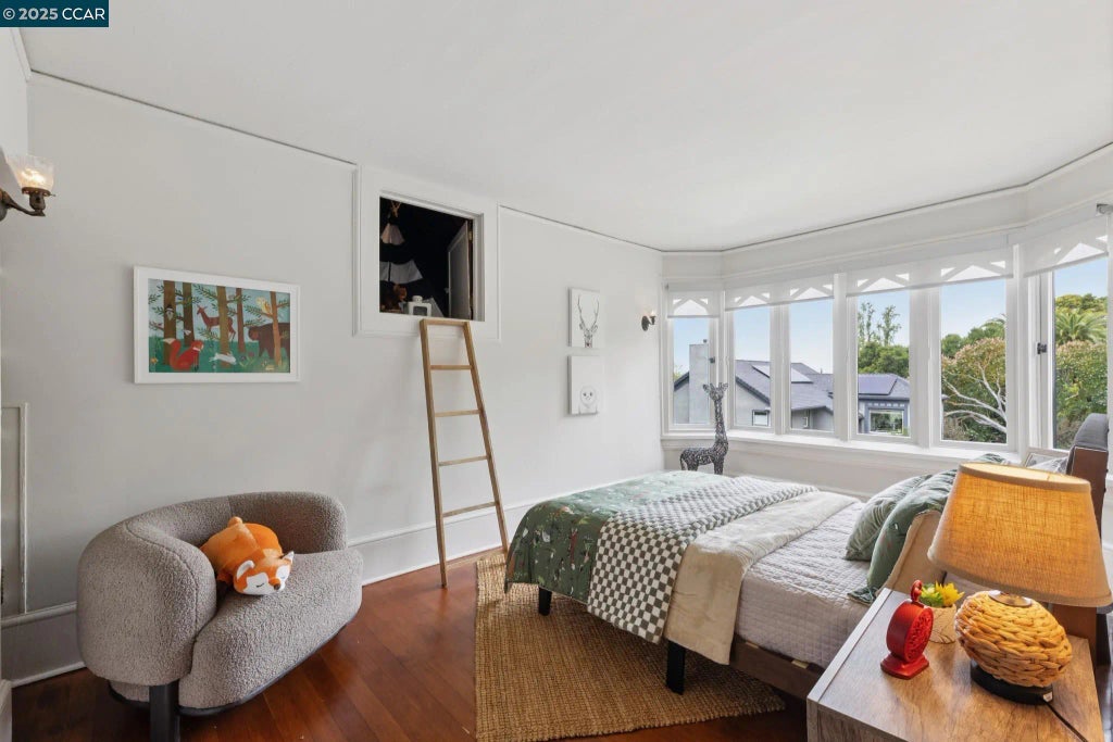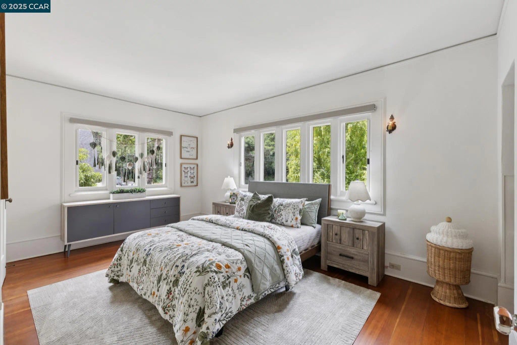 A large second bedroom is enhanced with multiple sets of view windows, and room for a large bed.