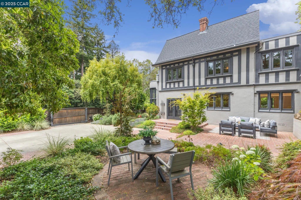 The impressive size of the entire home is revealed in this view of the rear yard. There are multiple seating areas throughout the well planned and long established gardens and patio.