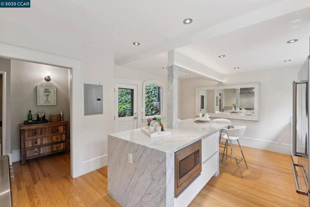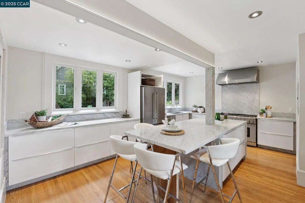 The kitchen has been impressively updated with custom cabinetry, top of the line appliances, and offers outstanding counter and workspace for the home chef.