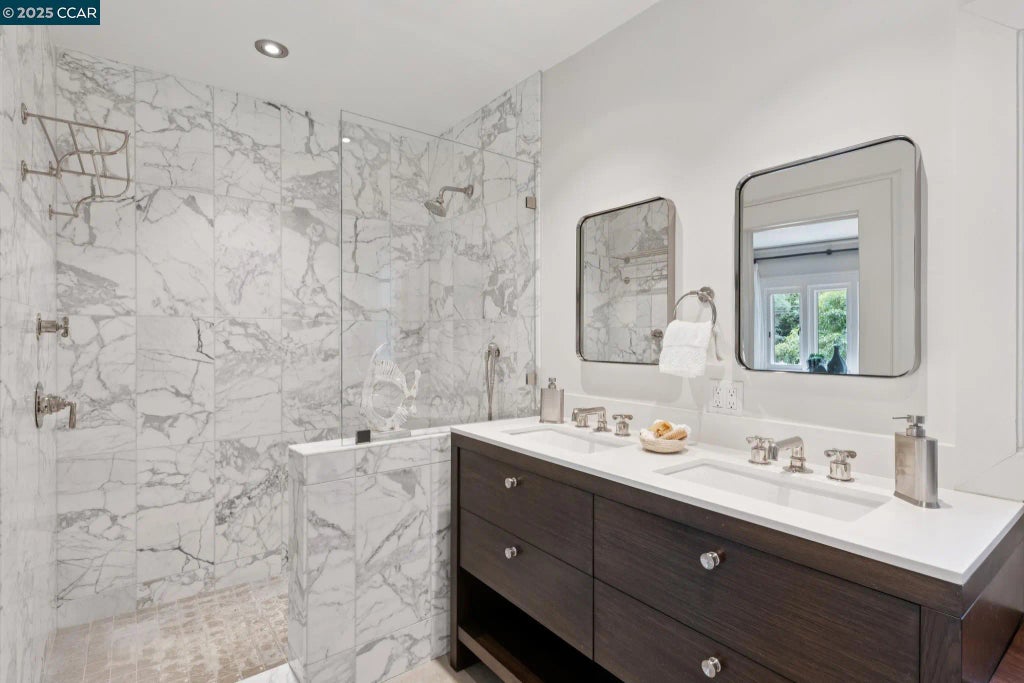 This cheerful and refreshed primary bathroom has dual sinks with matching mirrors above, and storage below. A large walk in shower is also present.