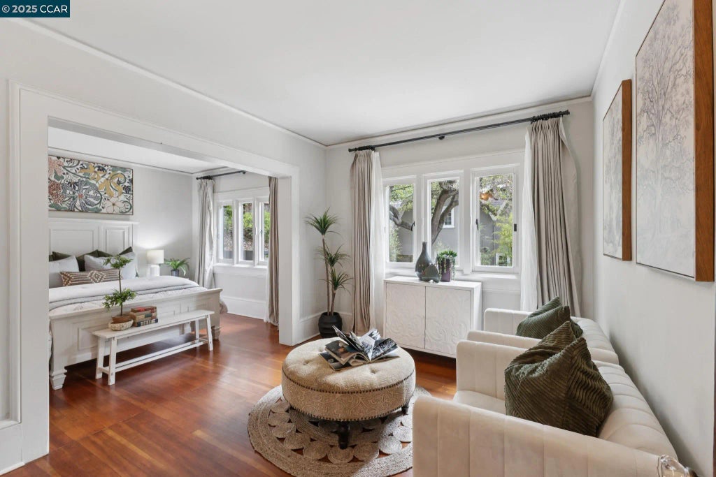 There are three bedrooms in the residence. The first, seen here, is the home's primary bedroom, complete with its own personal living suite. Two sets of windows invite in light from the exterior.