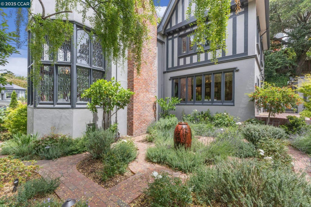 The gardens surrounding the home are carefully crafted, and placed with intent for enjoyment as one walks through them. The leaded glass window seen here is equally impressive from the outside as well.