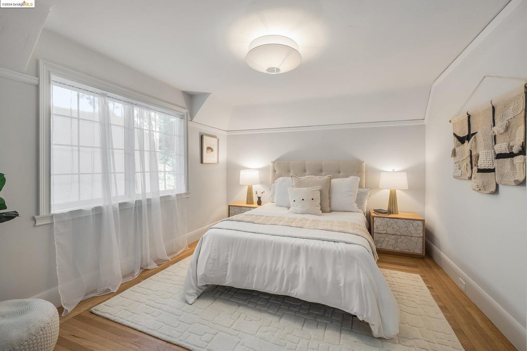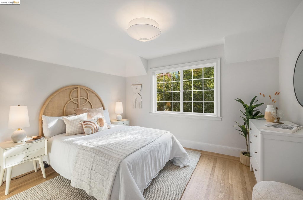 Nearby is this restful third bedroom that continues the home's color theme of light oak floors, and off white walls.