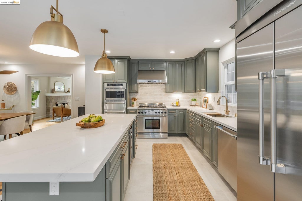 There are so many delights here that should please the fussiest home chef. Amenities include stainless steel Thermador appliances, dishwasher, gas range, microwave, refrigerator and double oven.