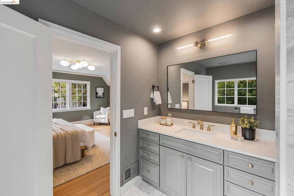 There are three bedrooms in the home. The first, seen here, is the impressive, and well conceived primary bedroom and en suite bathroom space. Both have been dramatically enhanced to provide the most pleasing of living spaces.