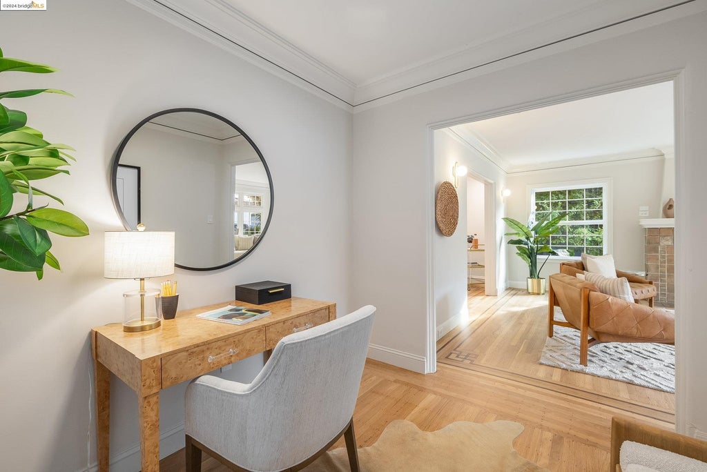 A small private office with desk and seating space just off the living room is an additional touch of charm to the overall ambiance.