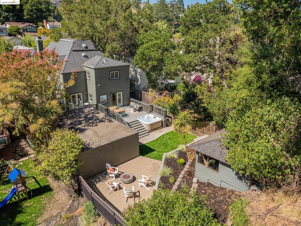 An overhead view of the rear gardens and patio reveals its size, its privacy, and the fully developed garden and trees that surround it.