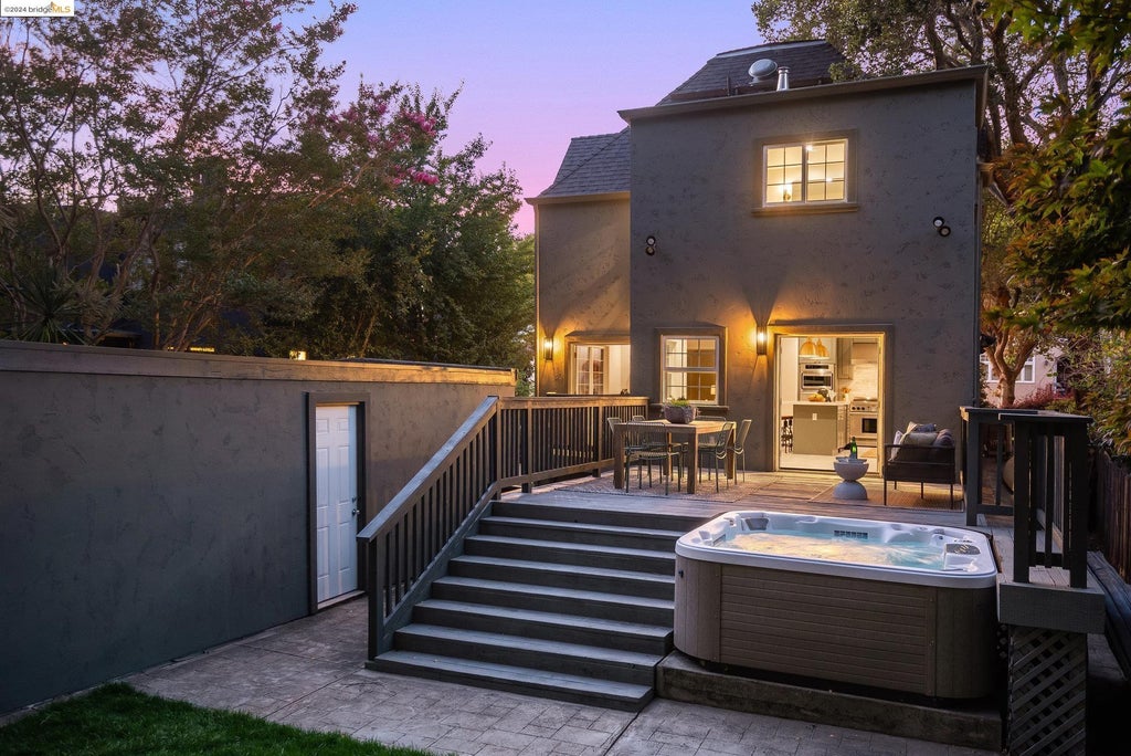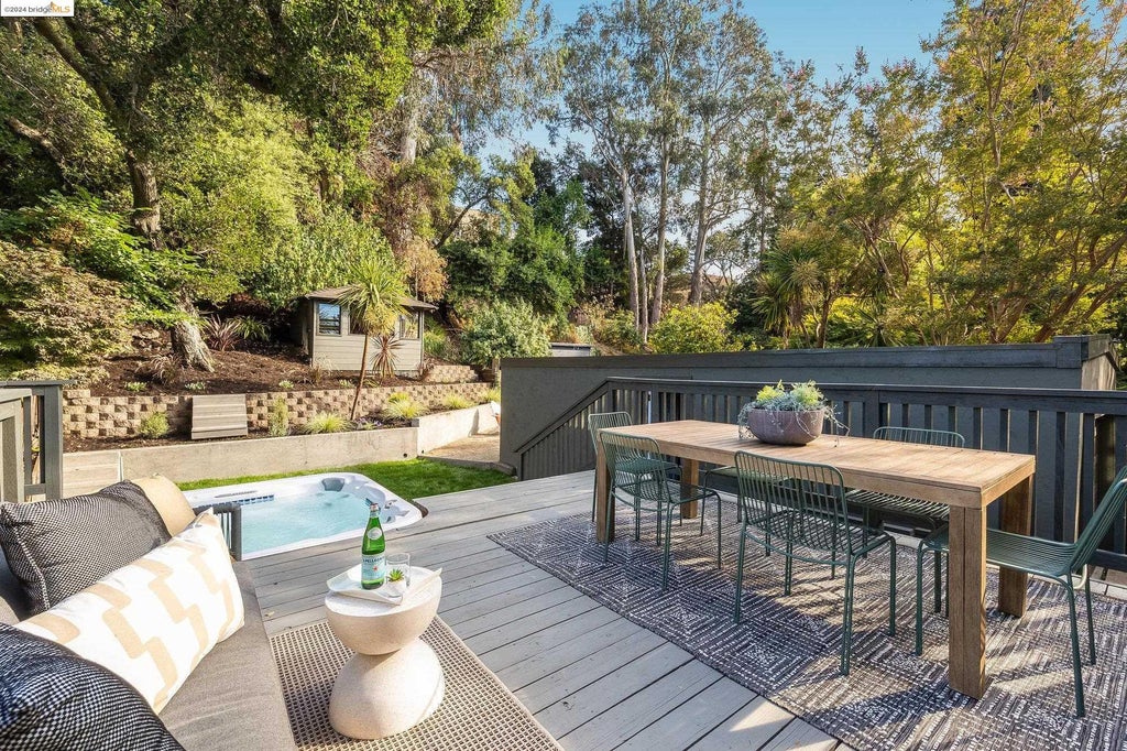 As will soon be seen, this house has an amazing rear garden and patio area. Just outside the kitchen doors is this wide wooden patio that easily accommodates numerous guests. Soft seating is to the left, dining table to the right, and a very inviting outdoor hot tub completes this delightful ambiance.