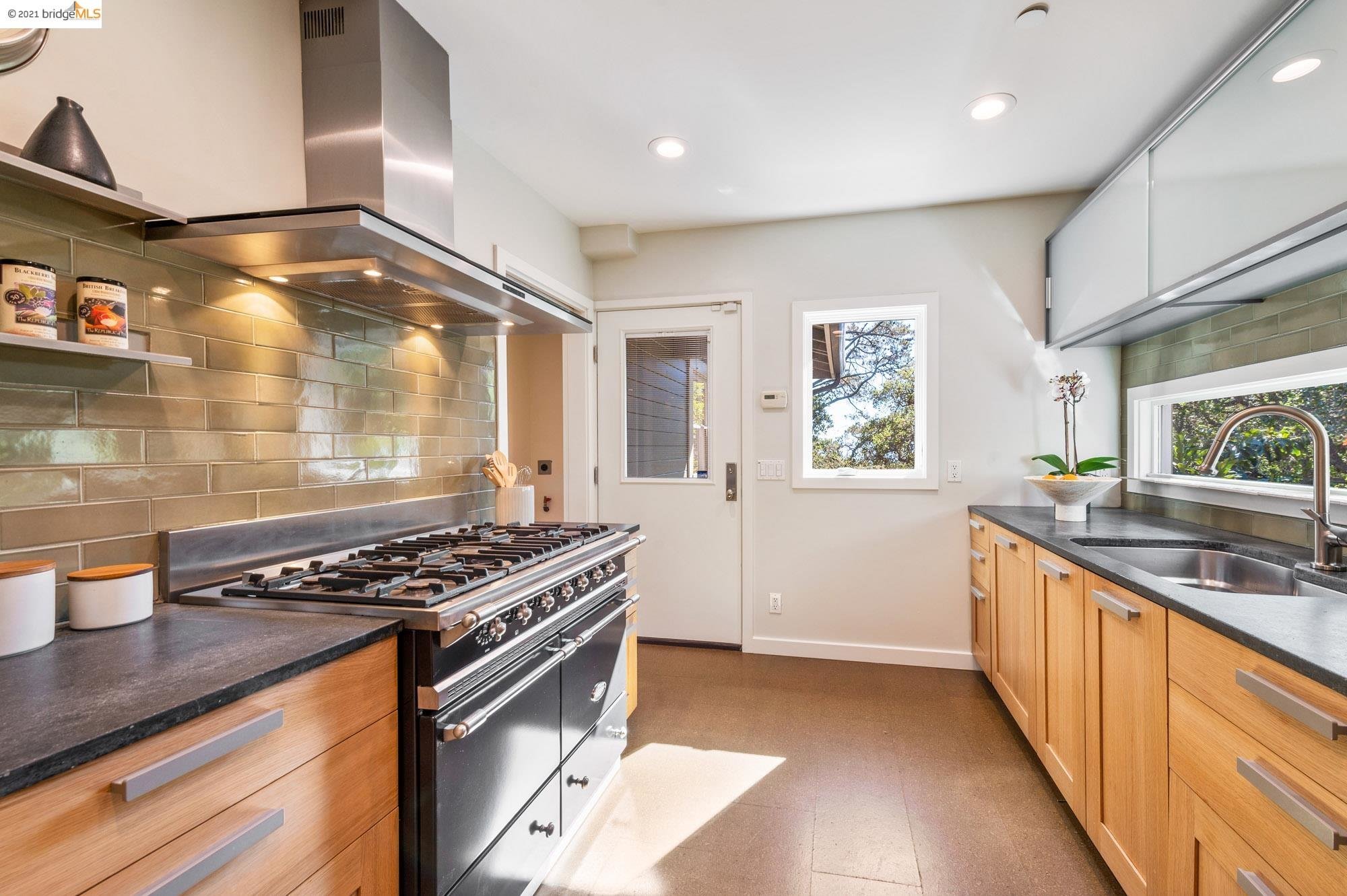 Immediately in view are the Lacanche range cooktop, the Sub-Zero wood paneled refrigerator, and the Miele dishwasher.