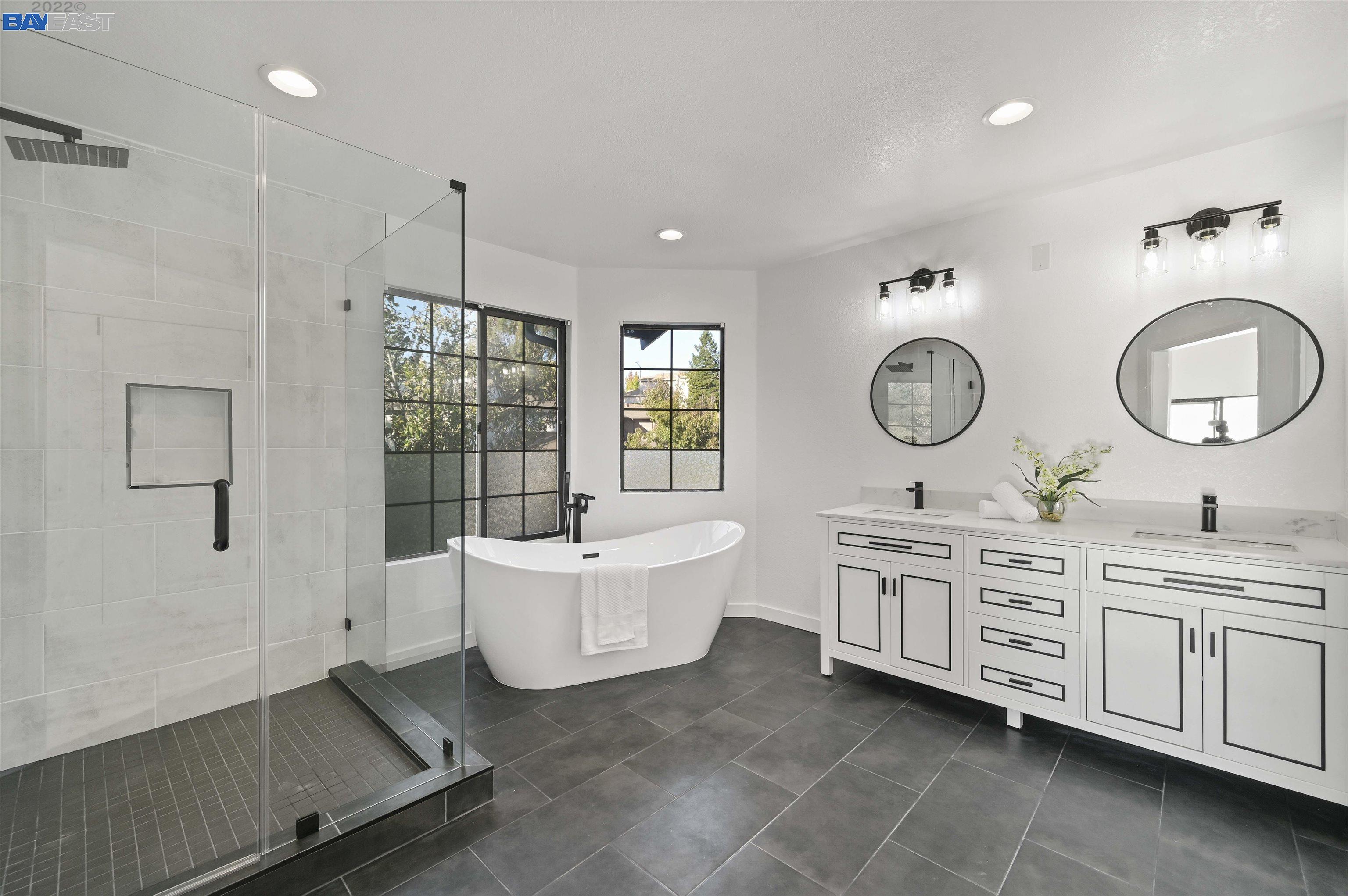 The primary bathroom is delight. A large soaking tub, and spacious stall shower combine with the large double sink counters, crisp overhead lighting, and view windows create an outstanding living experience.