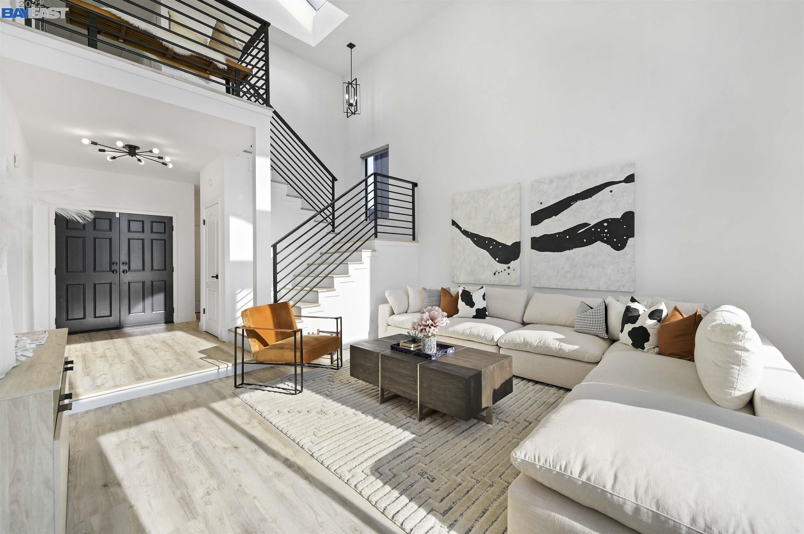 Just inside the handsome double door entry, a living space has been created to emphasize the harmony between the exterior expanse just outside the window, and the interior drama of a two story overhead ceiling that is paired with the floor to ceiling windows directly below.