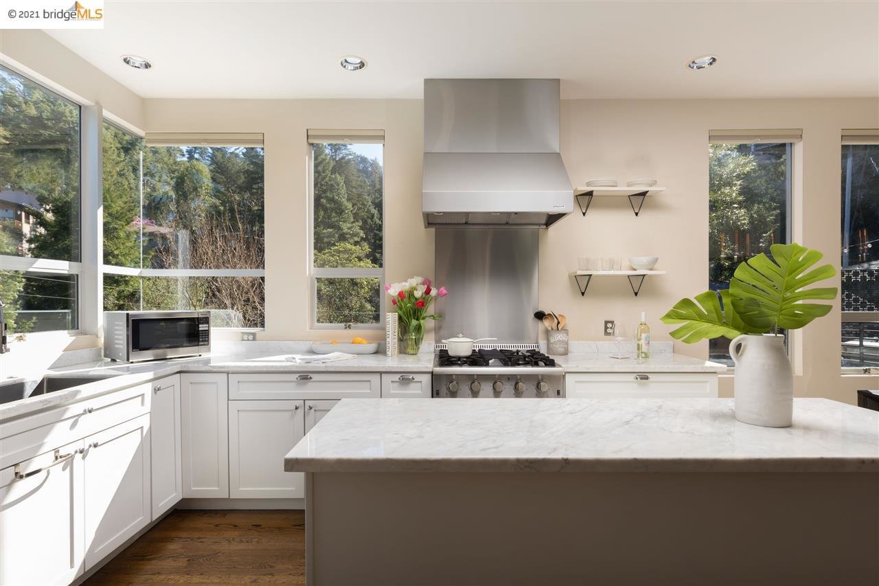 This very efficient working space features Carrera marble counters and a waterfall island which easily doubles as a generous workspace and breakfast bar. Additional amenities include a gas range/cooktop, refrigerator and wet bar. Surrounded by walls of windows with views to the hills and sheltering trees, this a choice corner of the home.