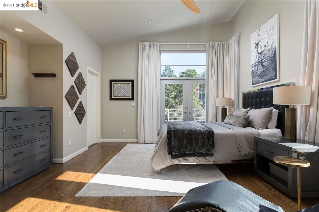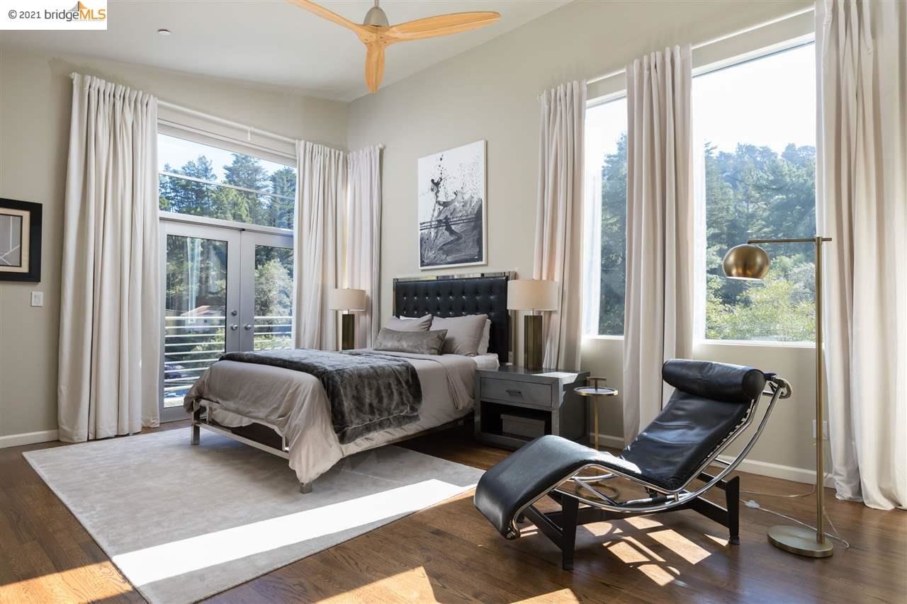 The top floor of the residence features the stunning primary suite seen here. Virtually located among the treetops, it provides a private outdoor view balcony that is accessed through a pair of French doors. Additional window space creates a warm and inviting ambiance, and the softly colored walls offer a perfect contrast to the richly colored hardwood floors.