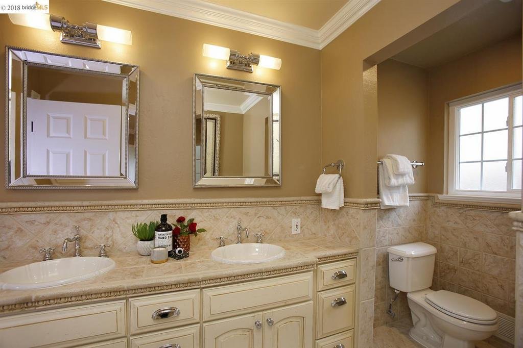 The second bathroom is as impressive as the first. The light from the matching overhead fixtures is reflected in the paired mirrors that meet the needs of users of these beautiful dual sinks. Additional appeal comes from the attractive trims above and below the sinks.