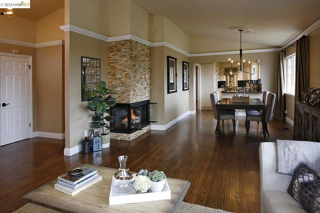 Immediately adjacent to the living room is this very spacious dining room anchored by a warm and welcoming fireplace. What a perfect location for entertaining friends while enjoying the views of the backyard and Bay area. This is an excellent view of the handsome hardwood floors in the home.