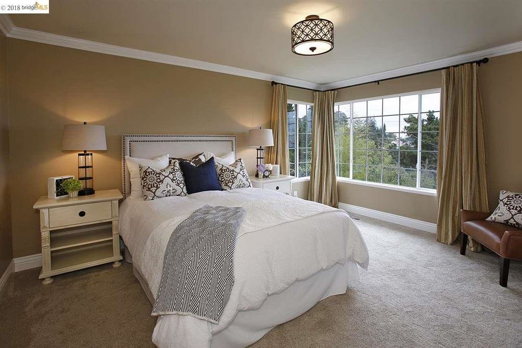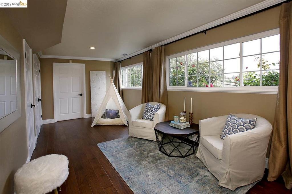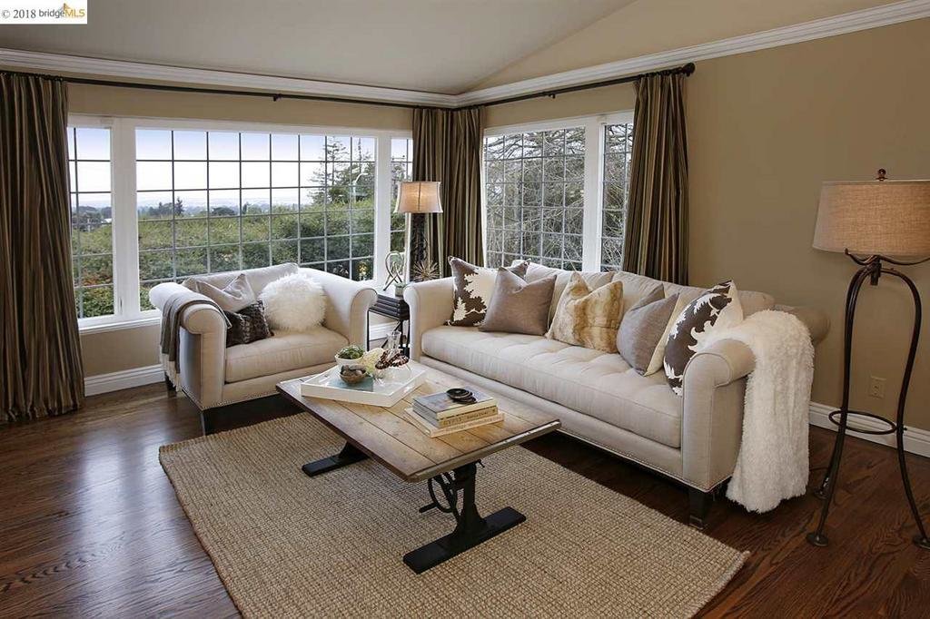 This previously mentioned extensive window space, seen in the living room below, opens onto relaxing Bay area views beyond the home. Worthy of notice are the extra touches of quality throughout the home, as seen here Be sure to note the desirable crown moulding above the windows, and the baseboard moulding that are found in most rooms throughout the home.