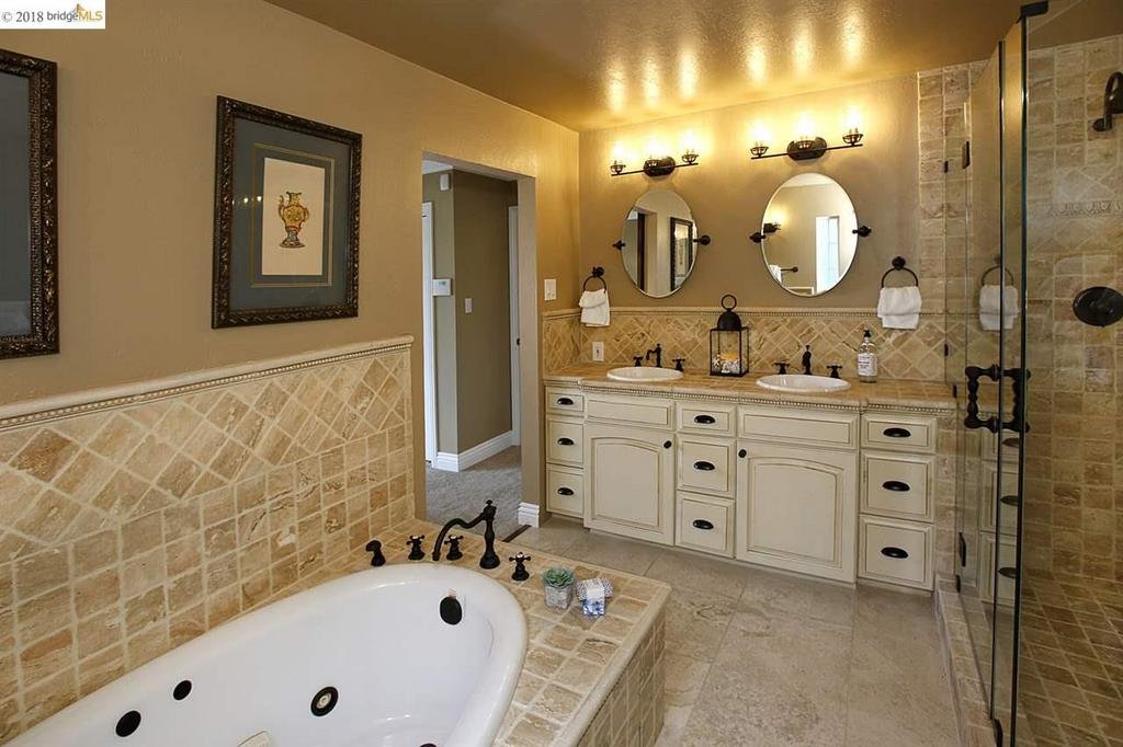 Adjacent to the master bedroom is this dramatic and beautifully detailed, master bathroom. The colorfully tiled tub with water jets is just perfect for relaxation at the end of a long day. Dual sinks, brightly updated lighting fixtures and roomy storage below makes this an ideal space.