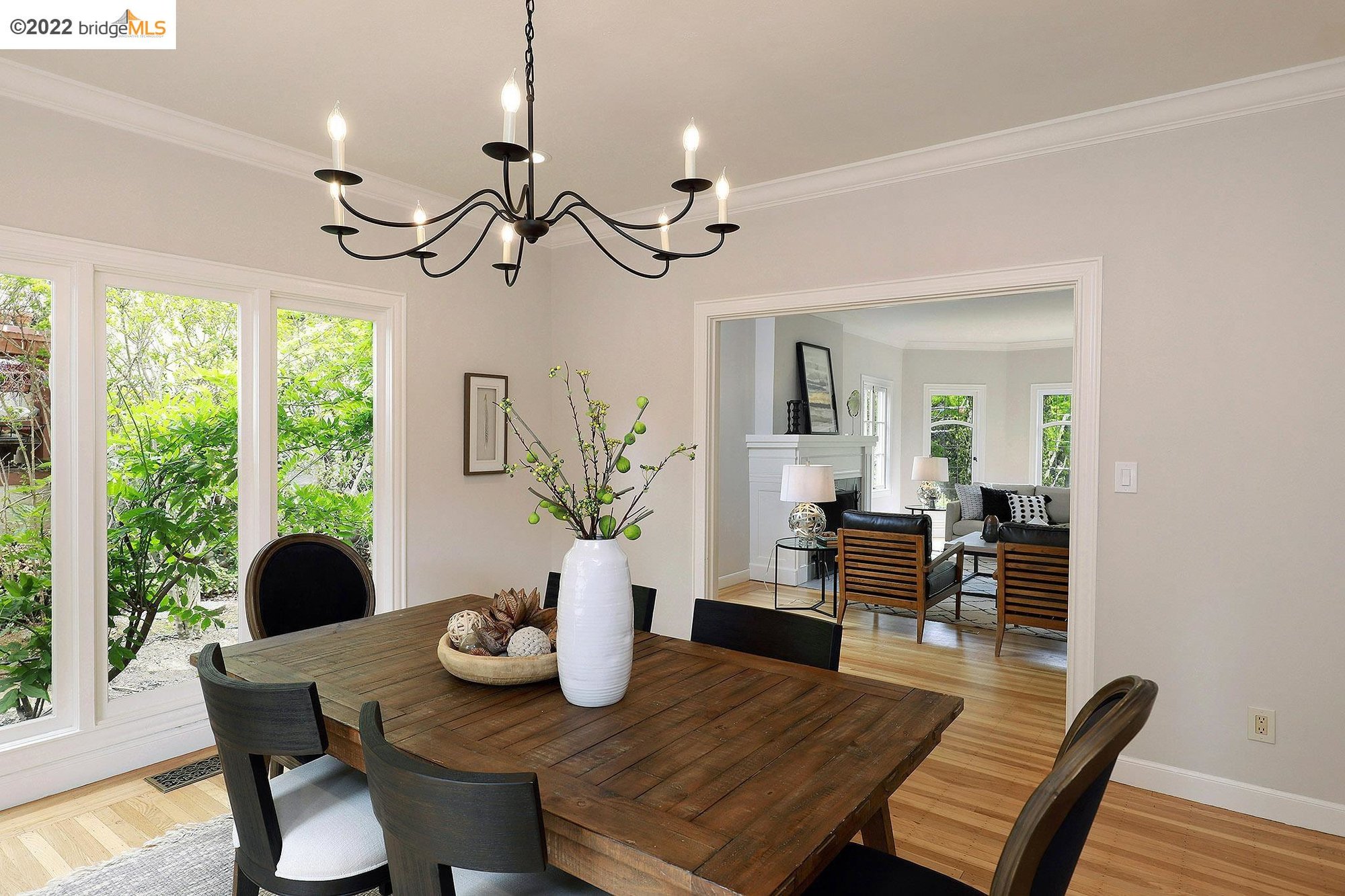 Just steps from the living room is this handsome, light filled dining room. The golden colored hardwood floors that are seen throughout the residence are especially visible here.