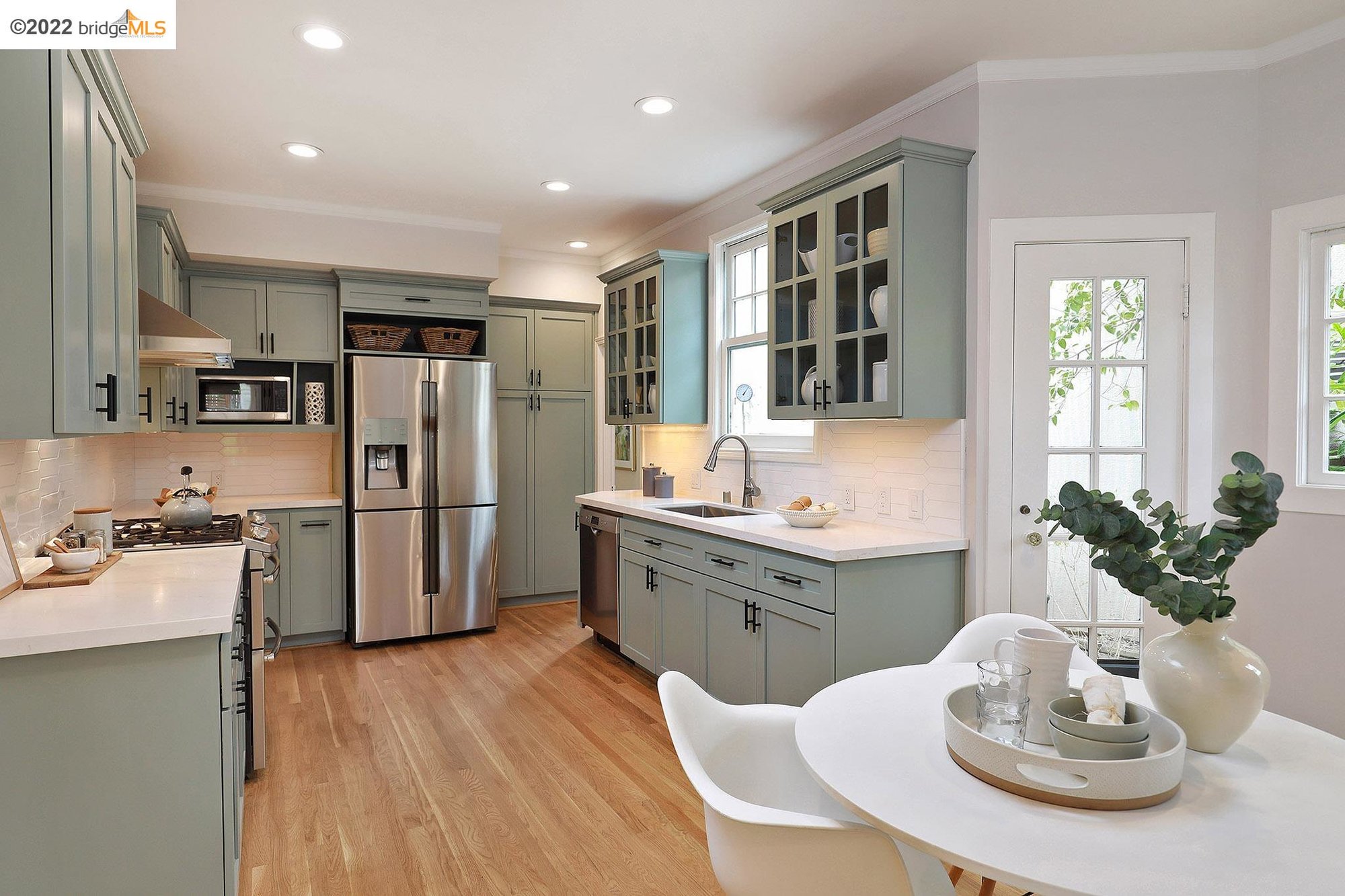 Always desirable stainless updated appliances are seen in both of the pictures. They include a dishwasher, a gas range/cooktop, dishwasher, refrigerator and microwave.