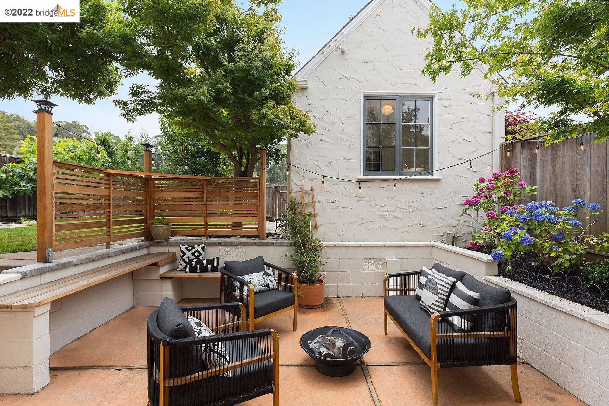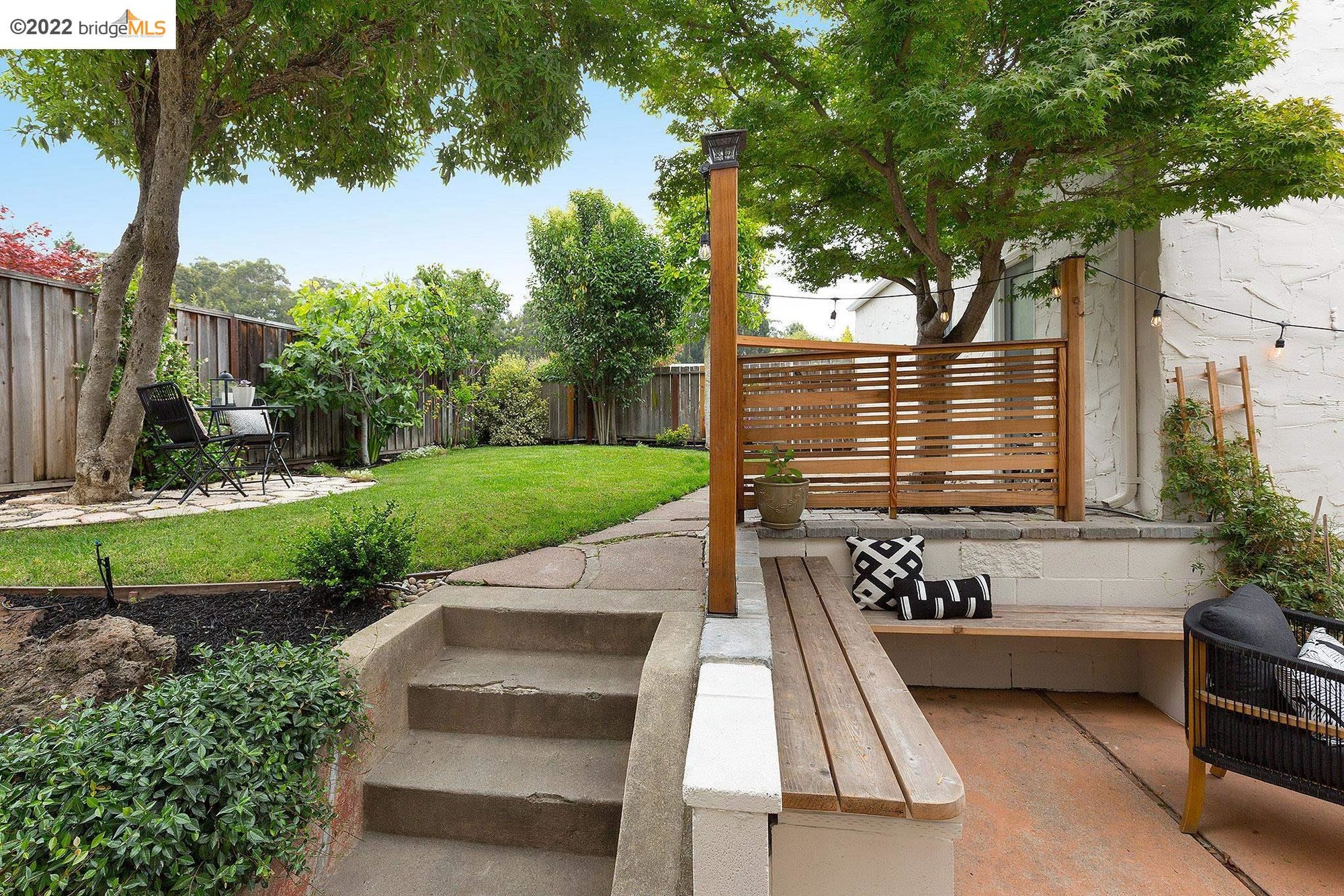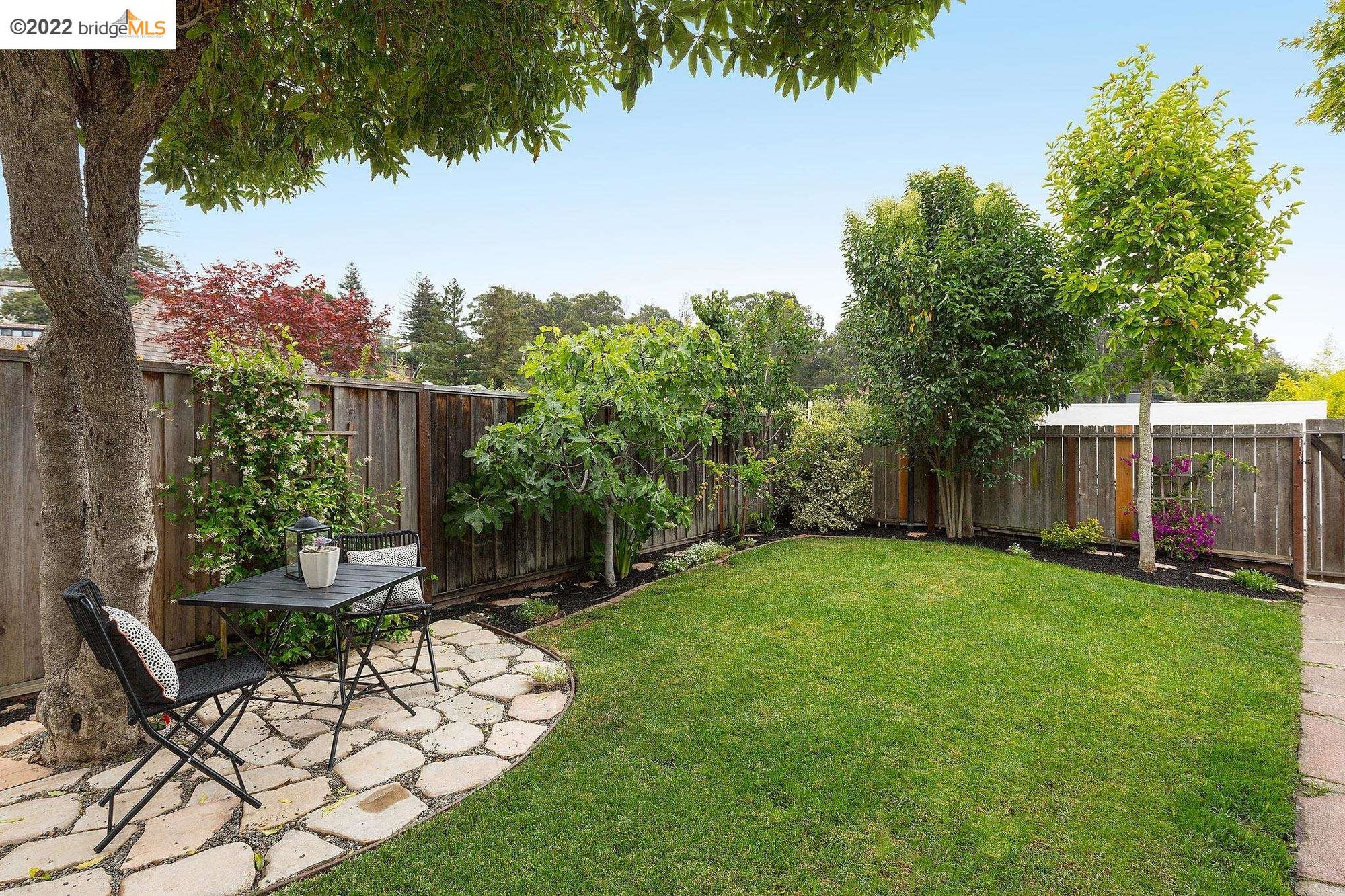 Fenced in for privacy, it features a small table under a large tree that would be ideal as a perfect spot for reading a good book while enjoying a tall glass of lemonade.
