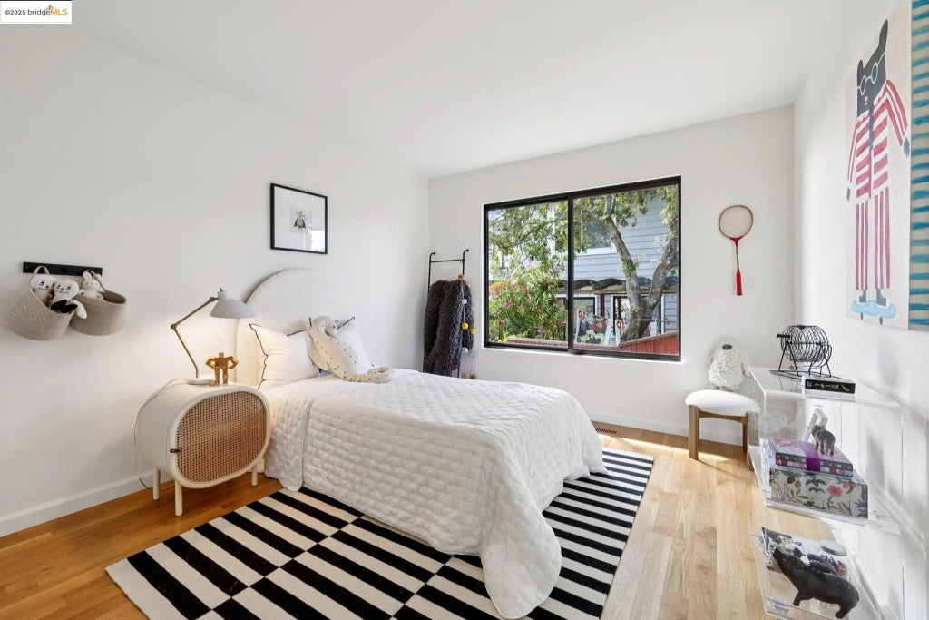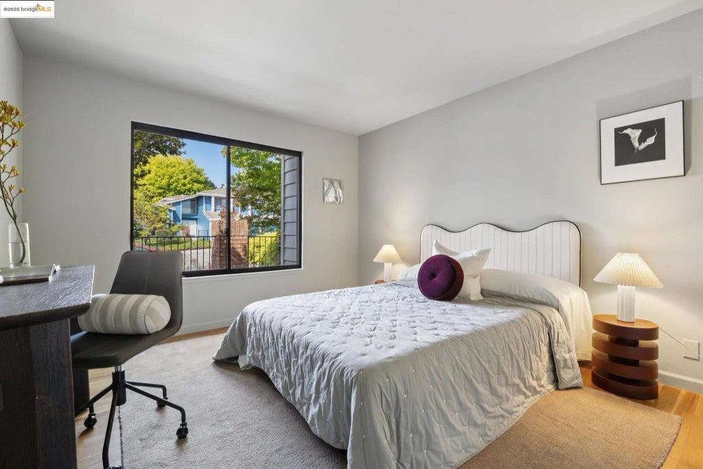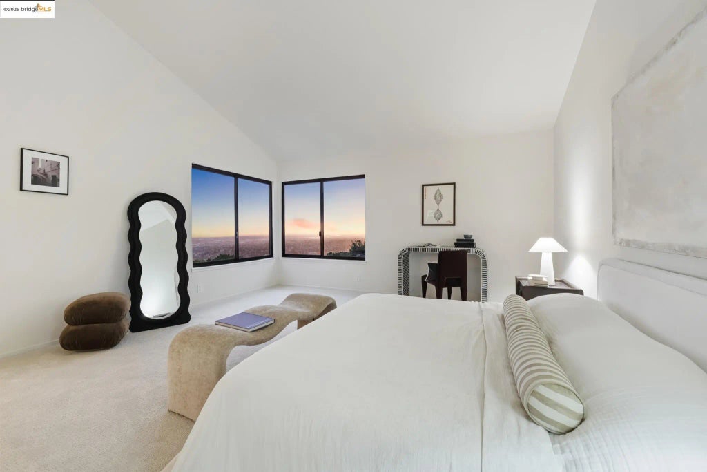 Next to be seen is the primary bedroom which has two sets of virtual floor to ceiling windows that reveal a private and personal vista of the Bay area scenes below.