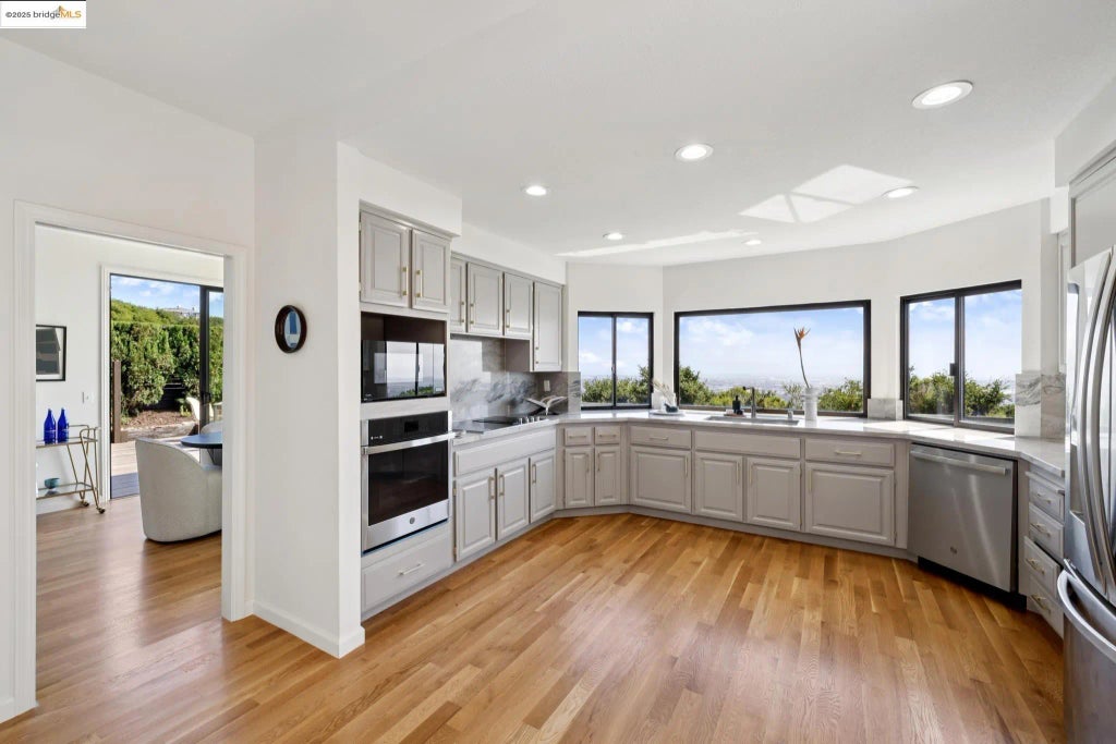 Directly off the dining area is this gently curved and engaging kitchen space that has its own special views to the west seen just outside its arc of windows.