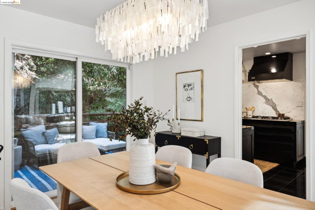 Yet another view of the dining room reveals its buffet server and, just steps away, the home's impressive kitchen. A better view of the home's private patio can be seen through the glass doors.