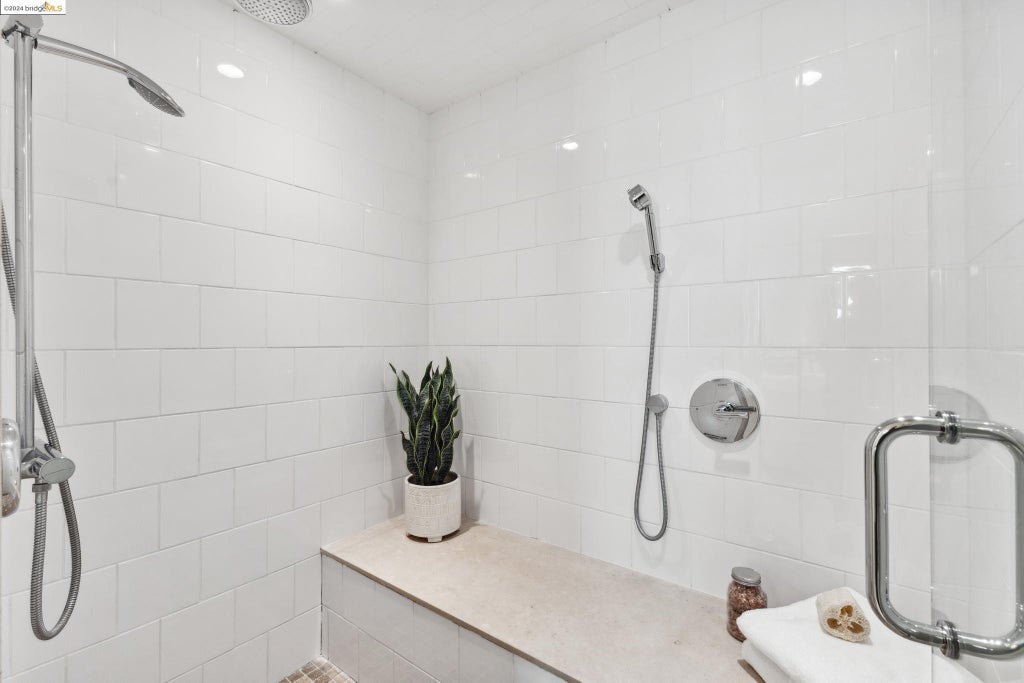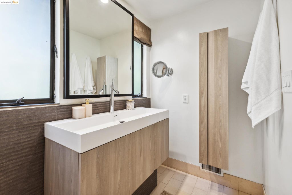 Passing further forward, one reaches this luminous and updated primary bathroom that adds more vision to an already dramatic ambiance.