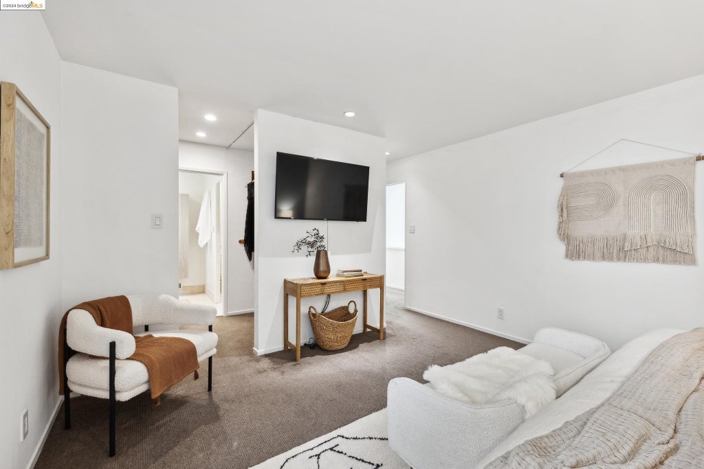 The living room itself is large, and is softly color coordinated with the hardwood floors and the subtle off white walls. It is anchored by a pleasant fireplace that is especially welcoming on cooler Bay area evenings.