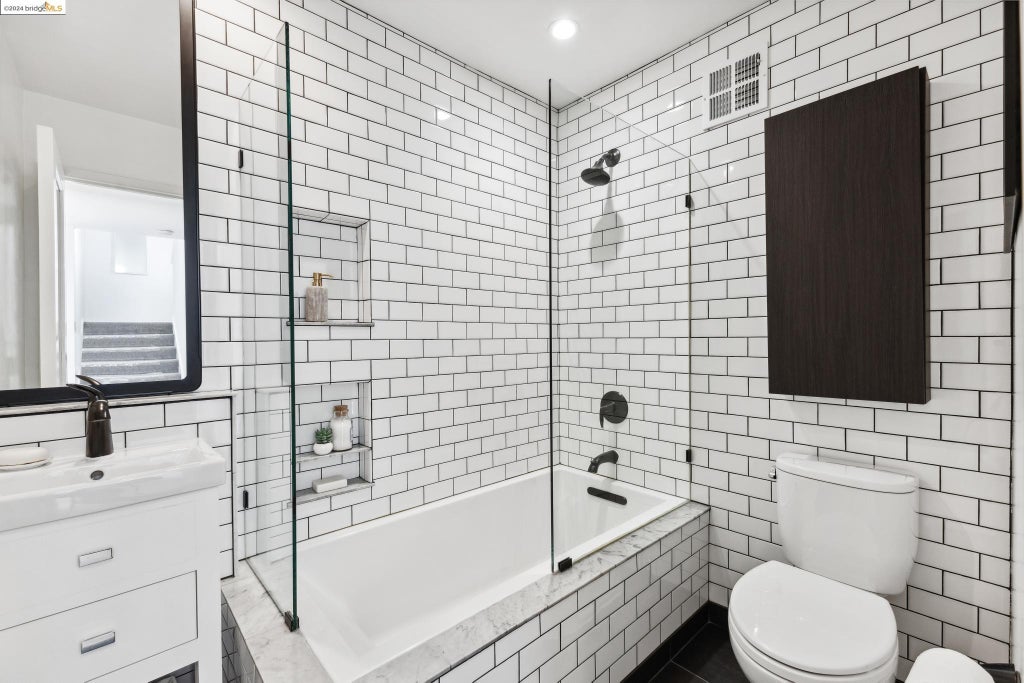 Also on the main floor is this gleaming updated bathroom with enclosed bathtub and shower and a high ceiling.