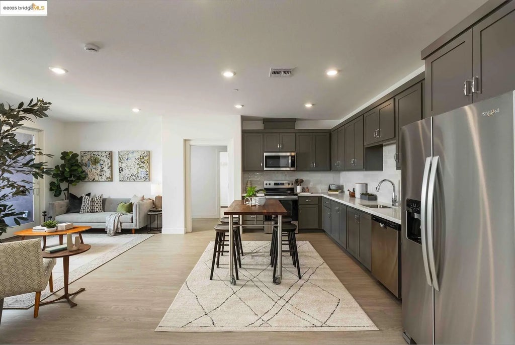 Turnkey new construction! This is a flat 1,309 square foot 2 bedroom 2 full bath and den home with a beautiful open floor plan and designer interior finishes. The floor plan features a spacious kitchen, living, and dining room area that opens onto a deck. There is a walk-in closet in the primary bedroom and more storage options throughout the home. The community will feature a dog park, overlook park, and a public walking trail within the community. Great location and a short walk to BART. Easy access to the 880 and 580 for commuters. Shopping and a variety of terrific restaurants are close by. Images shown are of a similar unit.