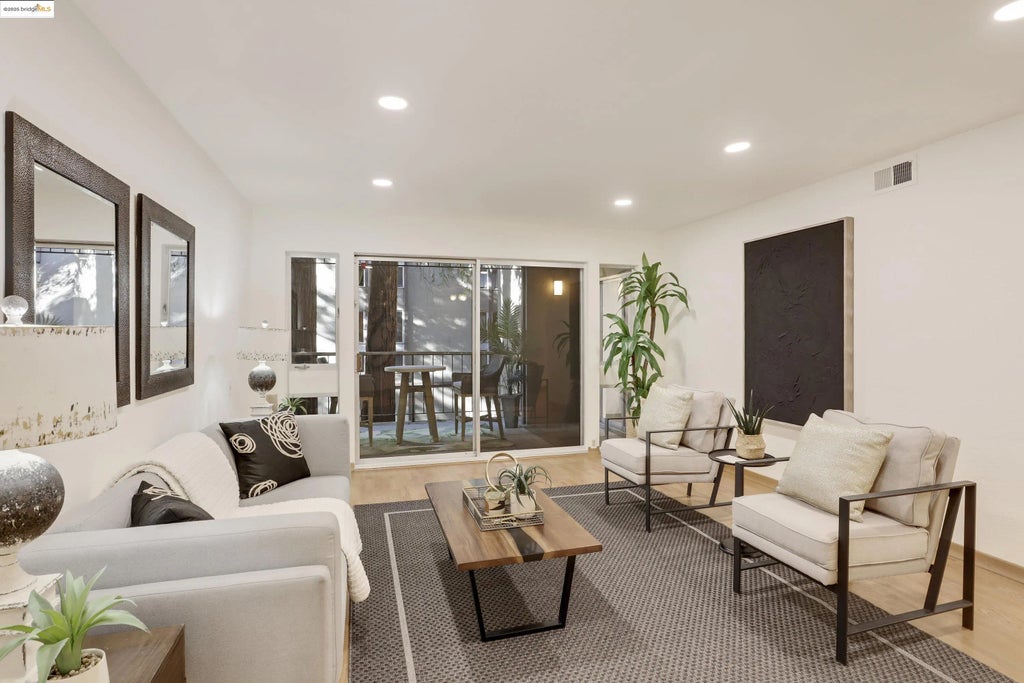 Experience comfort, peace, and a bright future at 323 Monte Vista Ave. #107, Oakland. This mid-century style condo offers 1,222 square feet of living space with storage that rivals single-family homes. Enter through a charming foyer with tile flooring and a vintage light fixture, leading to a spacious living room that opens to a large balcony via a sliding glass door. Surrounded by majestic Redwood Trees, this outdoor area is ideal for relaxation and entertaining. The dining space seamlessly connects to a beautifully updated kitchen featuring new stainless steel appliances, an expansive cabinetry system, and an additional eat-in area. Recessed lighting throughout enhances the home's ambiance. Down the hall, discover two thoughtfully arranged bedrooms, including a serene primary suite and two full baths. The primary suite offers a private retreat with balcony access, generous closet space, and an en-suite bathroom. Enjoy community laundry, an EV-charger-equipped parking spot, and extra storage. Perfectly located, you'll be close to vibrant Oakland destinations like Piedmont Avenue, Lake Merritt, and Rockridge. See what makes this home so special!