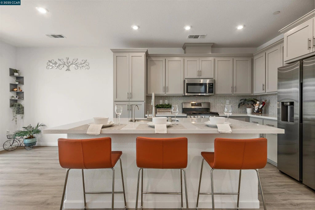 Located in the highly desirable San Marco community of Pittsburg, this stylish, energy-efficient duet built in 2021 offers 3 bedrooms, 2.5 bathrooms, and an attached 2-car garage. Step inside to find an open-concept layout with high ceilings, abundant natural light, and contemporary finishes throughout. The gourmet kitchen features quartz countertops, stainless steel appliances, ample cabinetry, and a spacious island—ideal for cooking and entertaining. The bright living and dining areas flow seamlessly to a cozy private patio. Upstairs, the spacious primary suite includes a spacious walk-in closet and an en-suite bathroom with dual vanities. Energy-efficient features include owned solar panels, a tankless water heater, and dual-pane windows, helping you save on utility bills year-round. HOA amenities include basketball, bocce and picnic area. Just a 1–2 minute drive to Starbucks, Sprouts Grocery, Cold Stone Creamery, and more. Minutes from Pittsburg Center BART, this home offers an easy 15-minute ride to Concord, about 35 minutes to Oakland, and under an hour to downtown San Francisco—ideal for professionals working at Kaiser, John Muir Health, PG&E, or in the Financial District. A dream location for East Bay and city commuters alike.