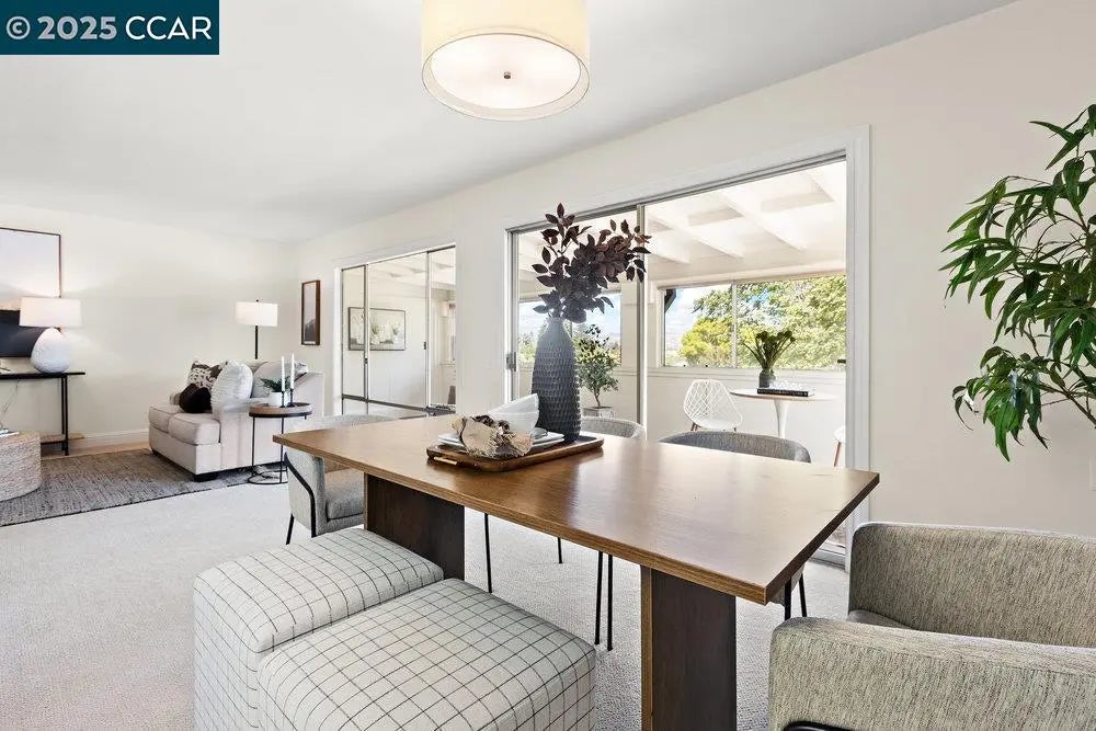 This bright and cheerful Sequoia Wrap end-unit is like a tree house with peekaboo views of Mt. Diablo and a great indoor outdoor vibe. The partially enclosed wrap creates a super spot for a home office or hobby space, while the open side deck invites morning coffee or evening sunsets. Windows in the kitchen and bath make the home feel even brighter. You’ll also appreciate the newer refrigerator, washer/dryer, and air conditioner, plus conveniences like smooth ceilings, a step-in shower, and in-unit laundry. Located in Rossmoor’s vibrant 55+ community, residents enjoy access to golf, pickleball, swimming, tennis, a top-notch fitness center, movie theater, art and hobby studios, and nearly 200 clubs and organizations. A welcoming space in an unbeatable setting.