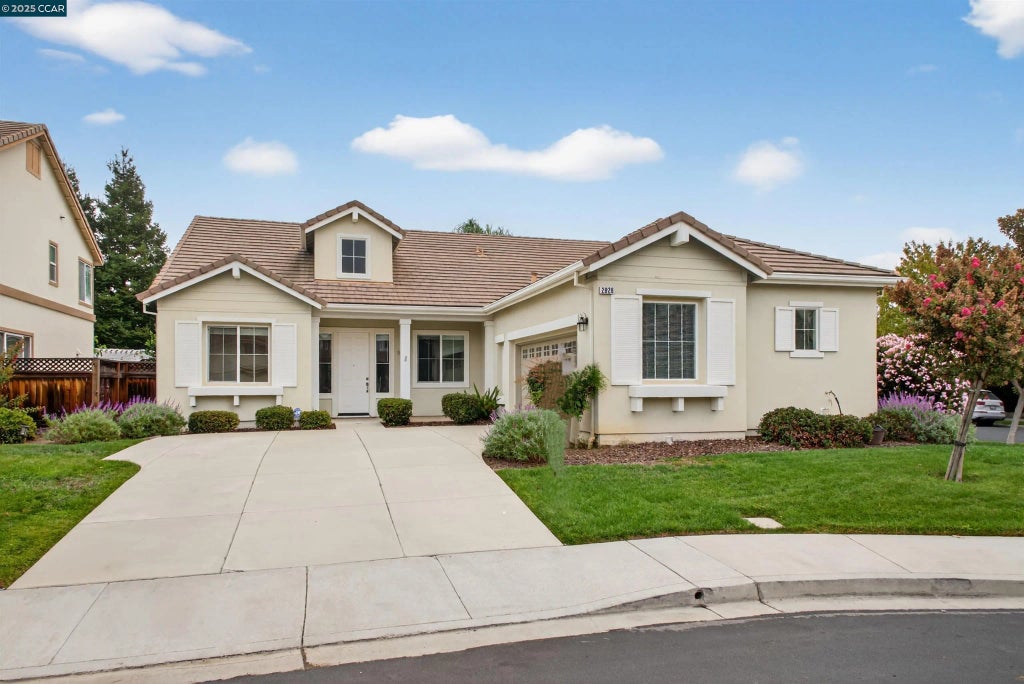 Beautiful single story home on corner lot featuring 10 foot ceilings, 4 bedrooms, 2 bath with 2 car garage. The front bonus room with ceiling fan could be an office, extra bedroom, exercise room, the possibilities are endless. A raised hearth with gas starter fireplace in family room. Kitchen has it all and more-spacious pantry, ample space for a bistro table and chairs, breakfast bar, island with veggie sink, tile floors and counters, desk area, storage, HOA includes community pool, spa, and clubhouse. A very elegant home that should not be missed. Envision your family in this open, bright and beautiful home. The oversized main bedroom has a ceiling fan, walk in closet and attached bath with a soaker tub. The separate dining room with its warm and intimate light fixture is perfect for those special occasion meals with family and friends. Stone Patio is perfect for barbeques and outdoor entertaining. Easily maintained yard with mature orange tree in yard. Walk to several parks, pool, schools. Close to shopping and transportation. Come by and fall in love with this home.