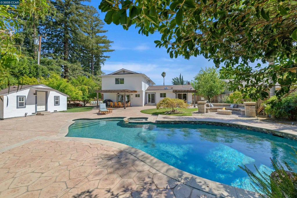 Welcome to this stunning two-story home nestled in Walnut Creek’s desirable Carriage Square neighborhood. Set on a nearly quarter-acre lot, this 4-bedroom, 2.5-bath residence features an updated kitchen with stainless steel appliances, recessed lighting and plenty of natural light throughout. The inviting front yard boasts five mature rose bushes, maple trees, custom-stamped concrete with a charming sitting area, updated stone accents, a newer driveway, and a redwood fence for privacy. Located on a quiet, cul-de-sac street, this home offers both tranquility and convenience—just a short walk to local shops, restaurants and Carondelet and De La Salle High Schools. Three sliding glass doors lead to a backyard designed for relaxation and entertaining. Enjoy the sparkling, solar-heated pool and hot tub, surrounded by low-voltage lighting, mature fruit trees—including orange, pomegranate, cherry, tangerine, and apricot—and two beautiful redwood pergolas. A gas fire pit sets the perfect evening ambiance, while the detached pool shed doubles as a cozy she-shed or storage space. Fully owned solar system and well water for irrigation result in very low utility bills This is the perfect home to experience the best of California indoor-outdoor living.