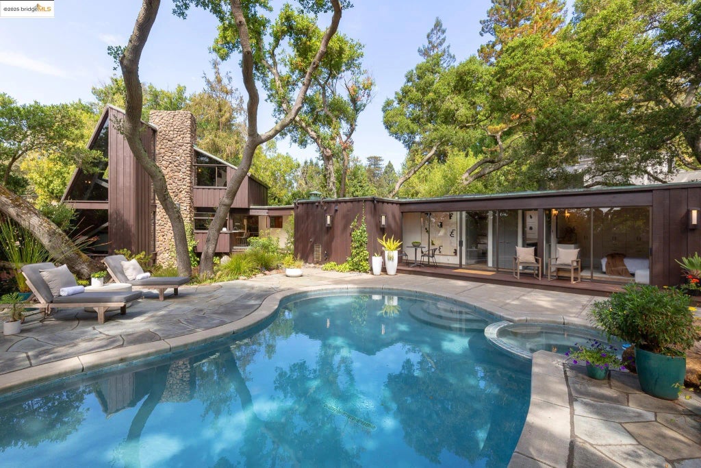Discover a rare architectural gem in Berkeley’s coveted Uplands neighborhood. Designed by architect Lyman Jee for his family, this sun-filled home is a private retreat that seamlessly blends design, nature, and tranquility. Set on a serene, oak-studded parcel, the home is introduced by a distinctive copper roof and a stained-wood footbridge spanning a rippling creek—a magical entry that sets the stage for what’s inside. Soaring ceilings, walls of glass, and a dramatic floor-to-ceiling stone fireplace create an inviting interior that frames the lush, landscaped surroundings. With three bedrooms, three full baths, & exceptional indoor-outdoor flow, this home was designed for both relaxation & entertaining. Step outside to the pool & hot tub for resort-style living, or enjoy the peaceful connection to nature from every room. The location offers the best of Berkeley living: Close to Claremont Resort, Fournee, Peets, the Elmwood’s charming shops and cafés, transbay transit, and it’s just minutes from UC Berkeley. A stunning piece of architecture, this home is ready for its next discerning owner who values design, tranquility, and a truly unique setting.
