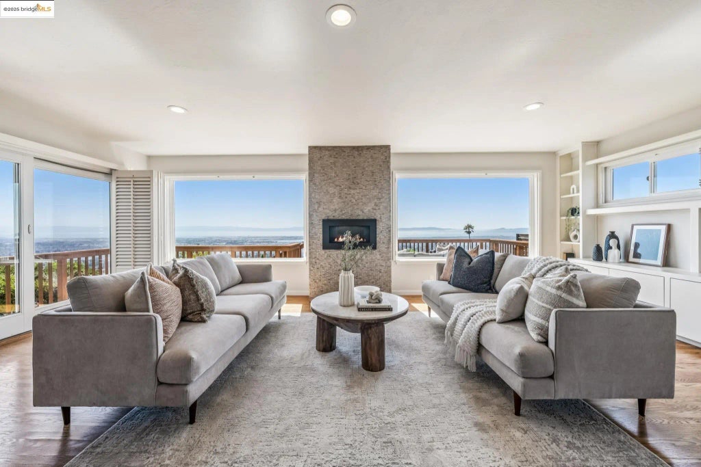 Perched to capture sweeping views of the Bay—including all four iconic bridges—this stunning Mid-Century Modern home blends timeless design with modern upgrades. This split-level residence offers both charm & contemporary comfort. The main level is perfect for entertaining, featuring a spacious open-concept living area with rich wood flooring, recessed lighting, custom built-ins, a dramatic stone fireplace, and oversized picture windows that frame the breathtaking views. Step outside to the expansive deck or patio and enjoy the ultimate indoor-outdoor lifestyle—ideal for relaxing or hosting with the Bay as your backdrop. The updated kitchen is a chef’s dream, showcasing natural shaker-style cabinetry, granite countertops, a white porcelain farmhouse sink, stainless steel appliances, a breakfast nook, and plantation shutters. Upstairs, you'll find three bedrooms, including a generous ensuite primary. The recently renovated guest bathroom offers modern finishes & thoughtful design. New central heating & AC system with new ducting throughout the home, complete repiping of the entire house, new exterior paint, freshly landscaped front & back yard. The lower level includes the garage, office space, half-bathroom, laundry, & convenient access to the backyard patio. 101chadbourne.com